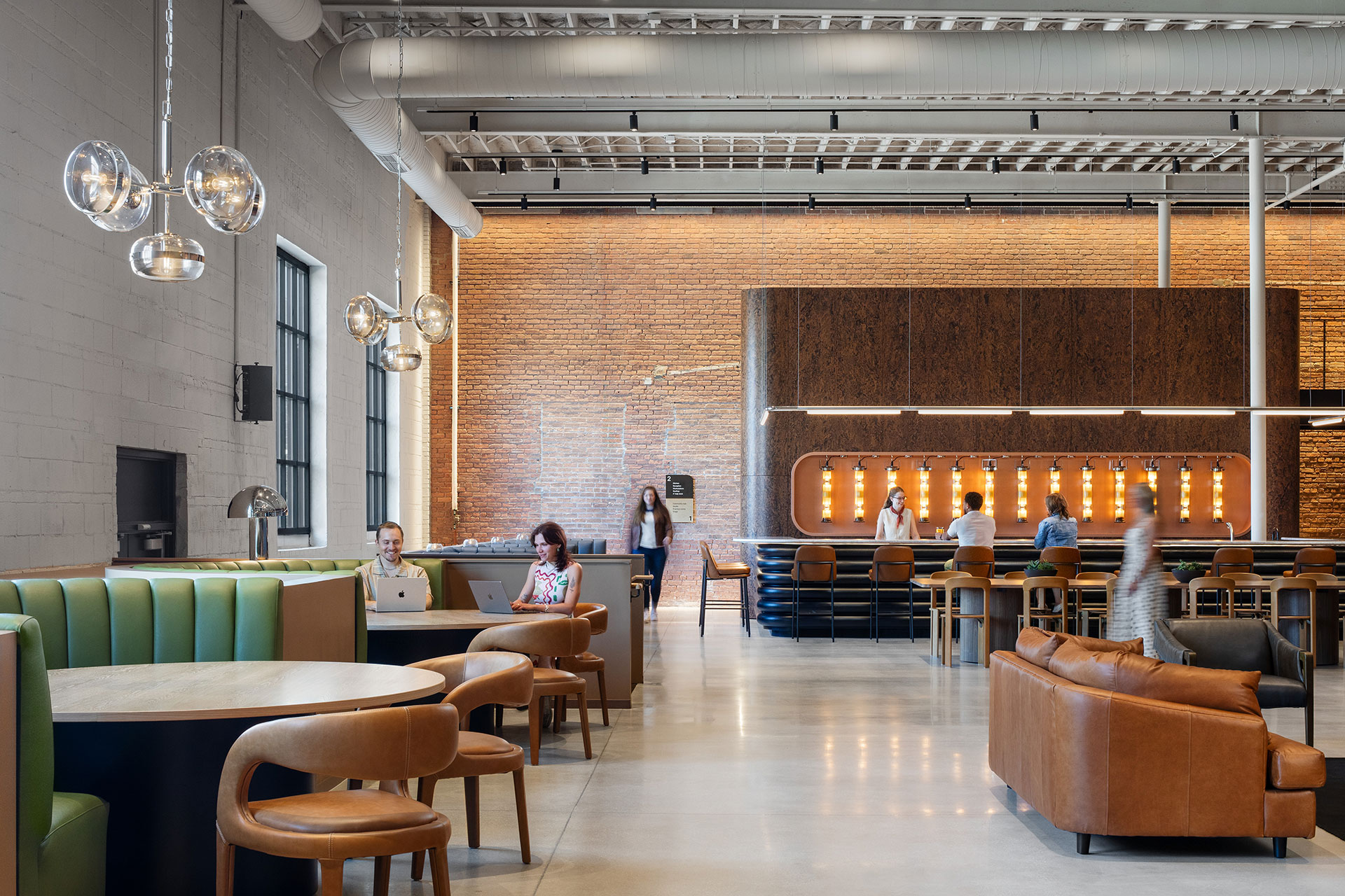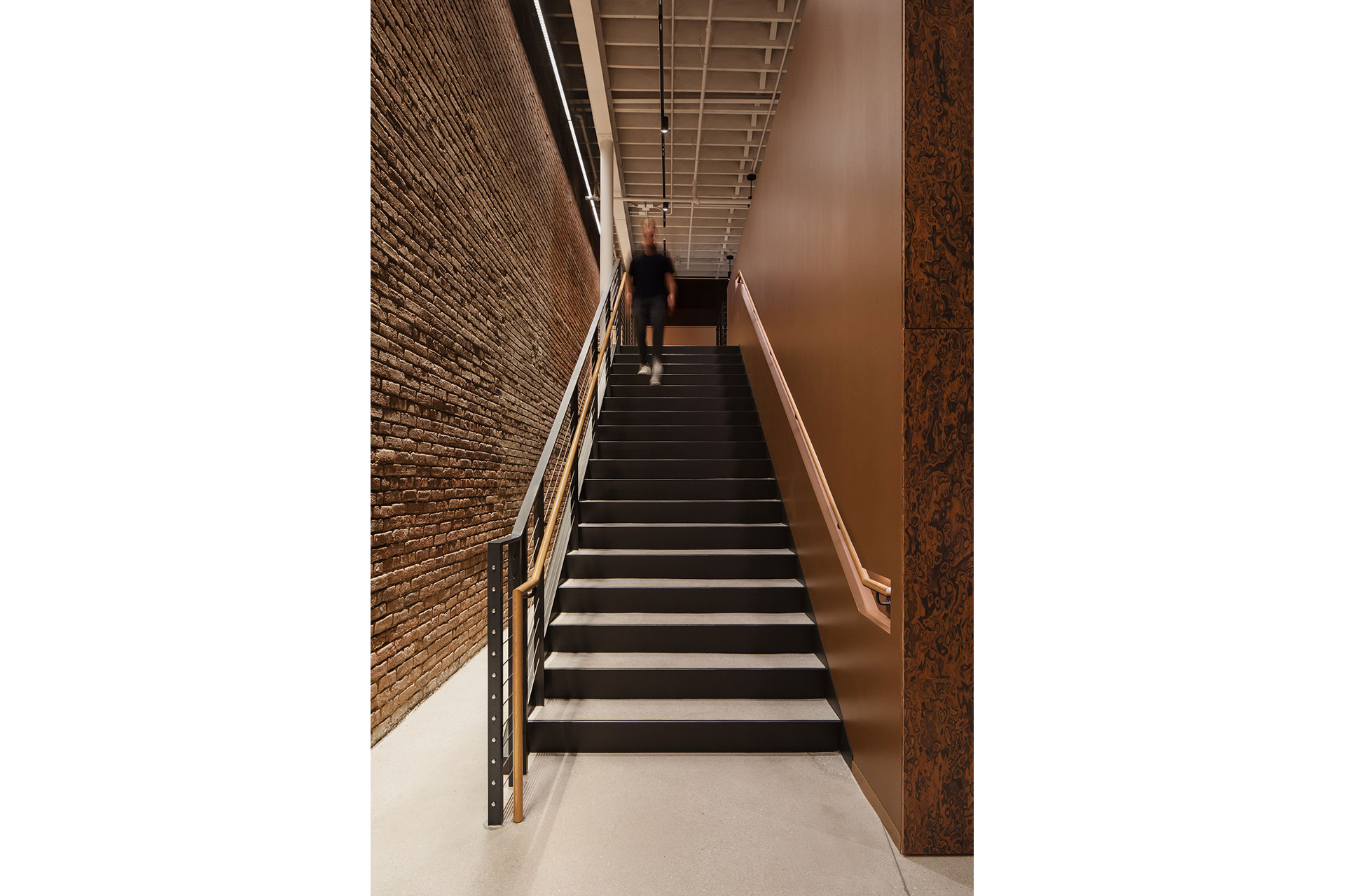 Guests travel from the mezzanine to the lower gathering area through a staircase hidden behind the bar. Linear grazers accentuate the texture and warmth of the 20-foot-tall brick wall. A continuous, illuminated pocket in the gypsum wall illuminates the handrail.
