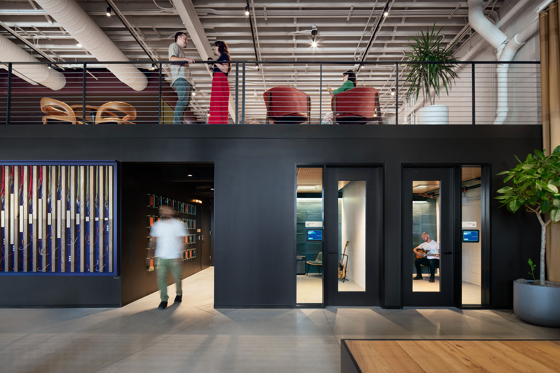 A recording studio and practice rooms are below the mezzanine. Linear wallslots illuminate acoustical tile walls and provide vertical illumination for reading music and playing instruments.