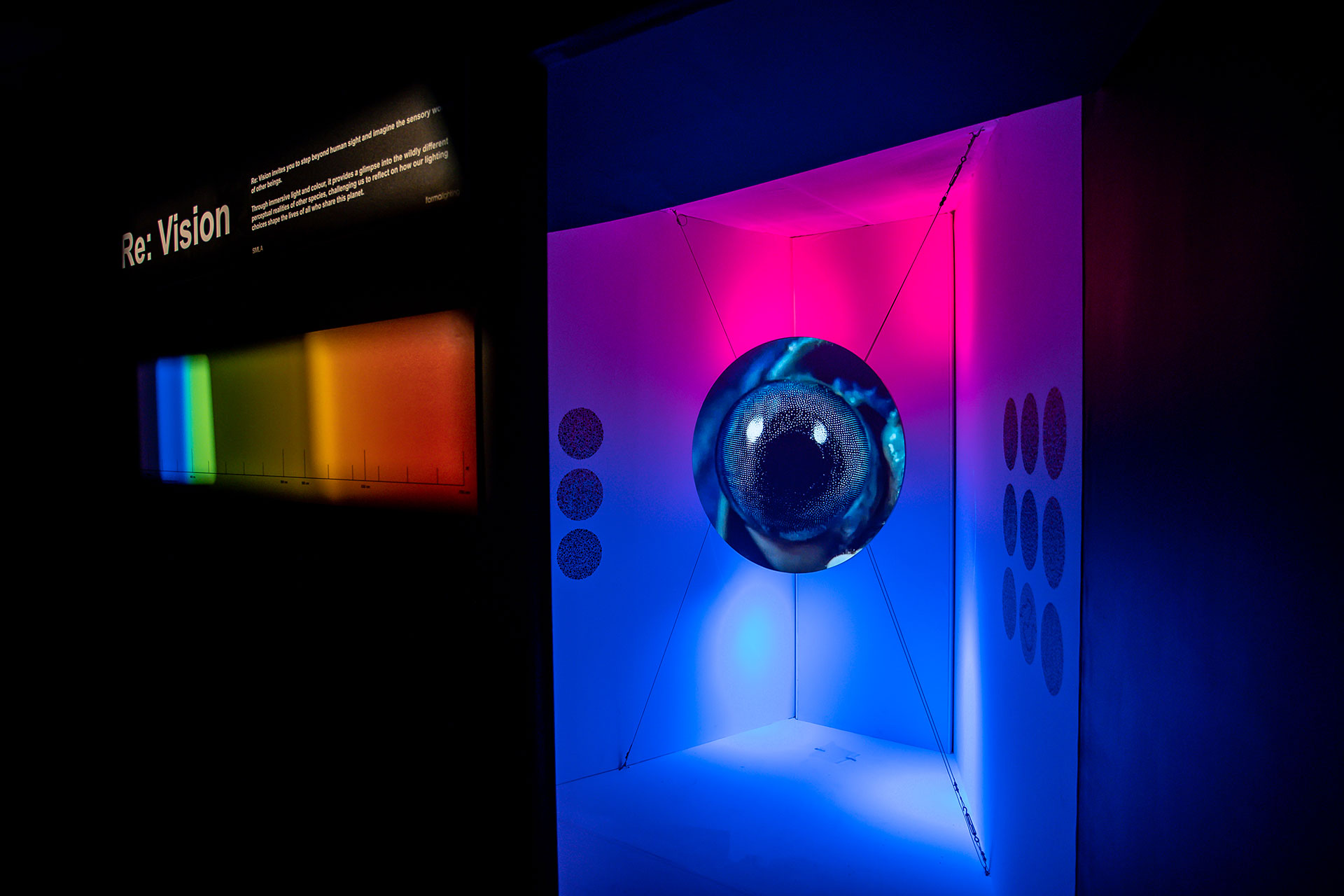 To translate complex scientific research into an accessible experience, Speirs Major and formalighting crafted a series of environments, each based on the spectral vision of different animals. Within these spaces, visitors encountered Ishihara-style colour charts – familiar to many as tests for colour blindness – which appear or vanish depending on the available spectrum. The result was both playful and profound: an artistic incitement that makes us question how others, human or otherwise, perceive the world.