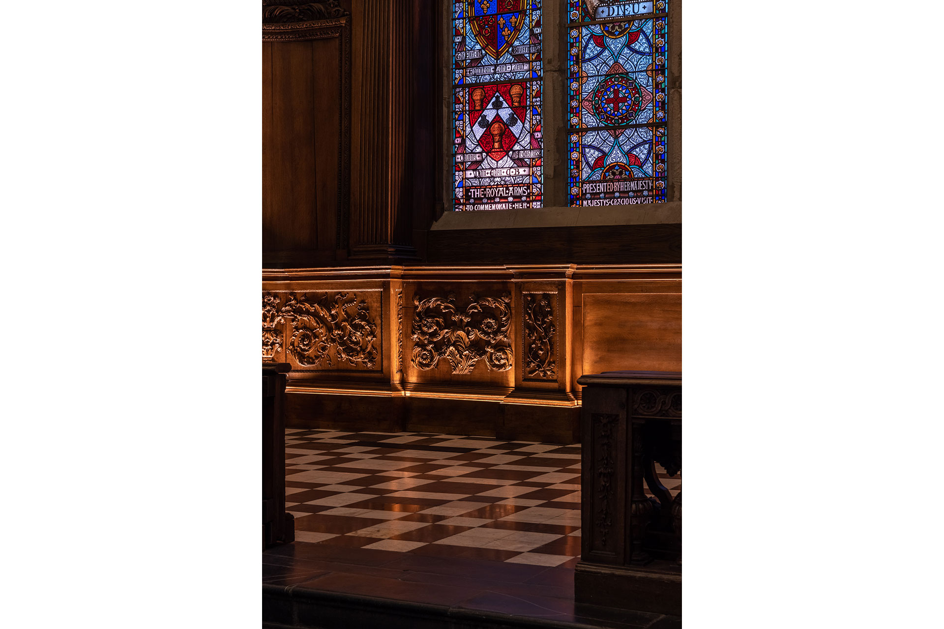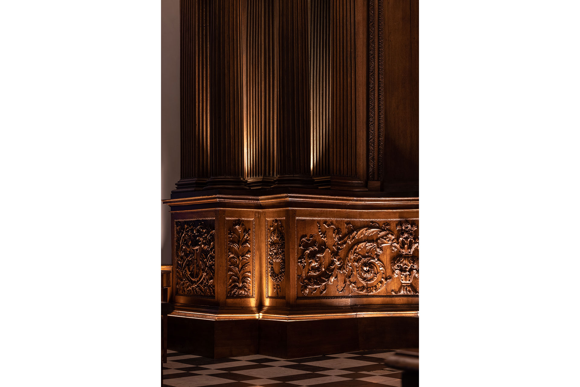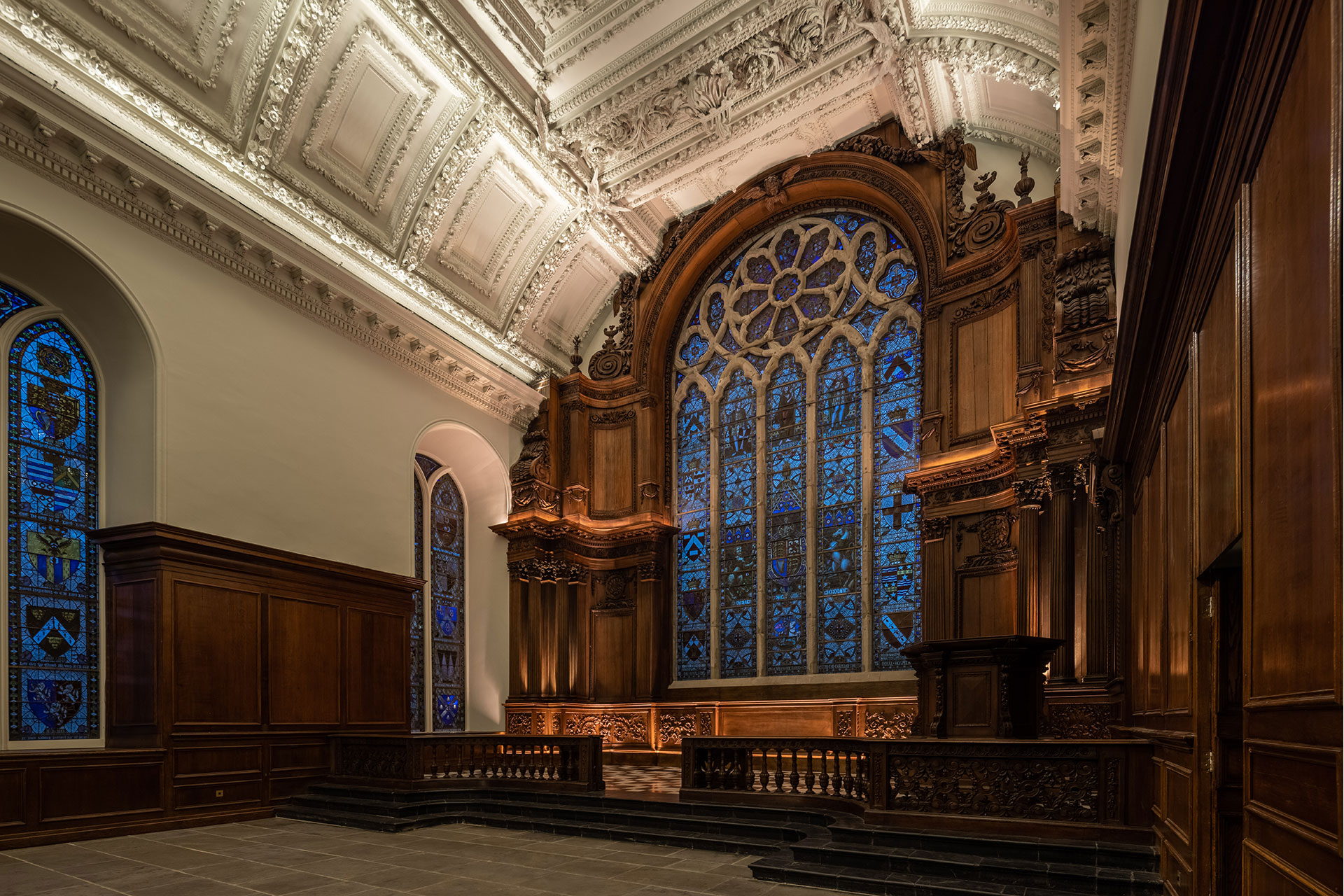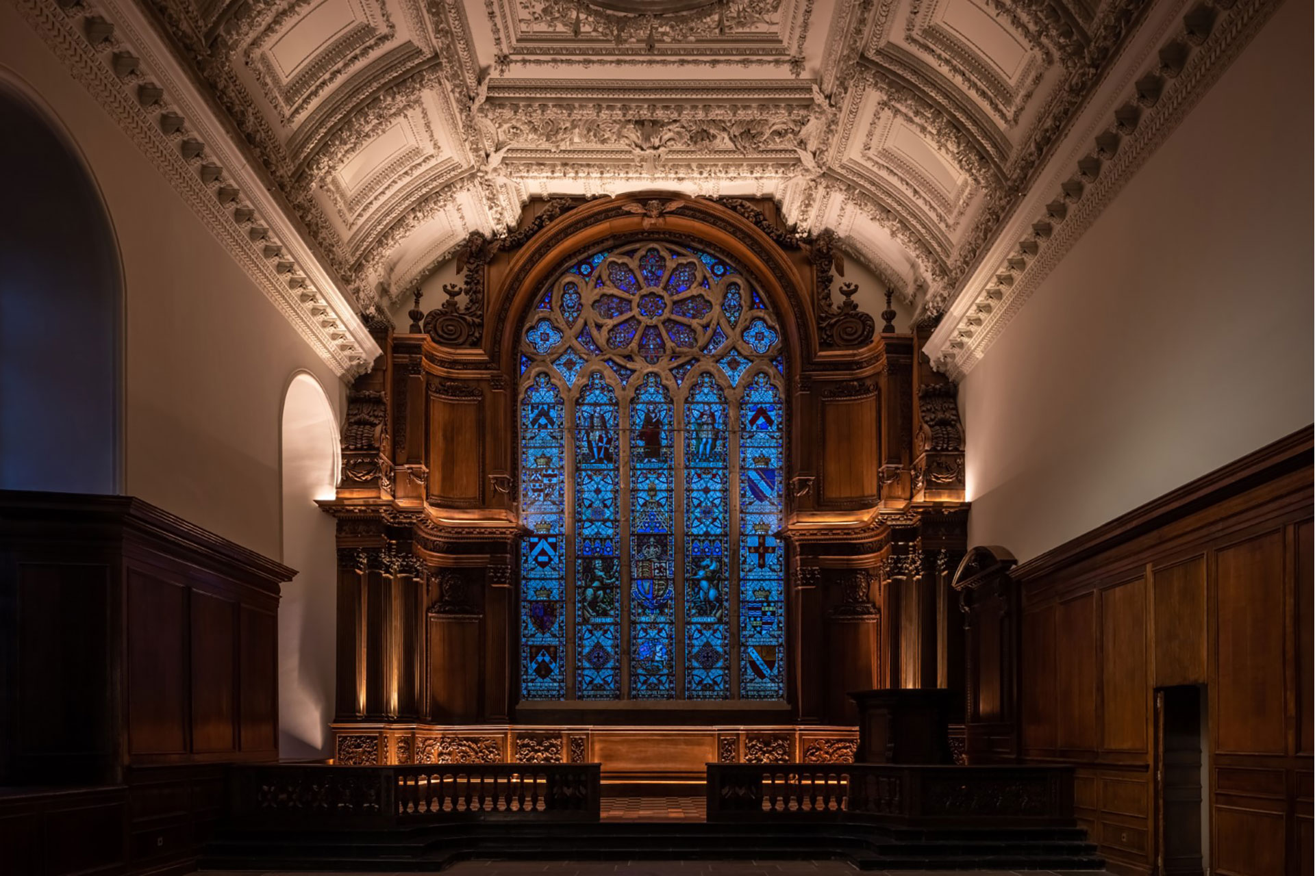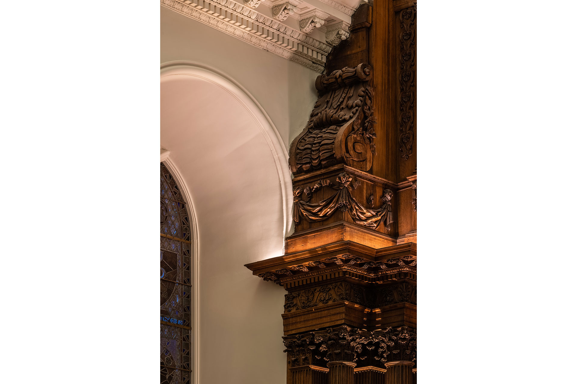 Modern lighting was discreetly integrated into the historic fabric, with fittings concealed in cornices, joinery and mouldings. Bespoke details, developed with conservation specialists, highlight the hand-carved timber, ornate plasterwork and historic artworks. Extensive mock-ups were used to test materials, angles & colour temperature, ensuring a precise balance of light and shadow to bring carvings and ceilings to life. Warm 2400K tones recall candlelight at the altar, while 2700K high-CRI sources reveal artwork and plaster ceilings. Hidden uplighting adds drama and three-dimensionality to the papier-mâché ceiling.
