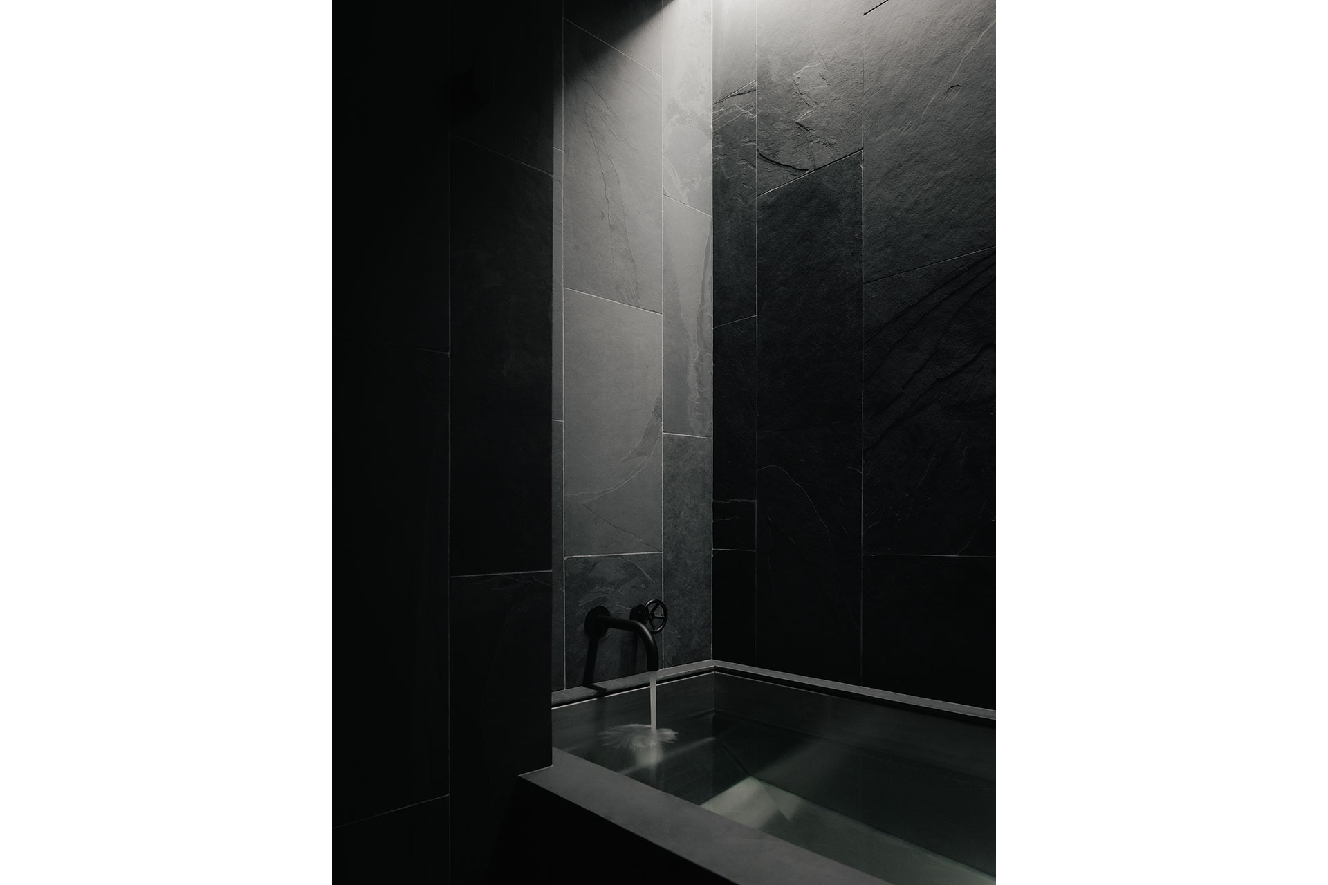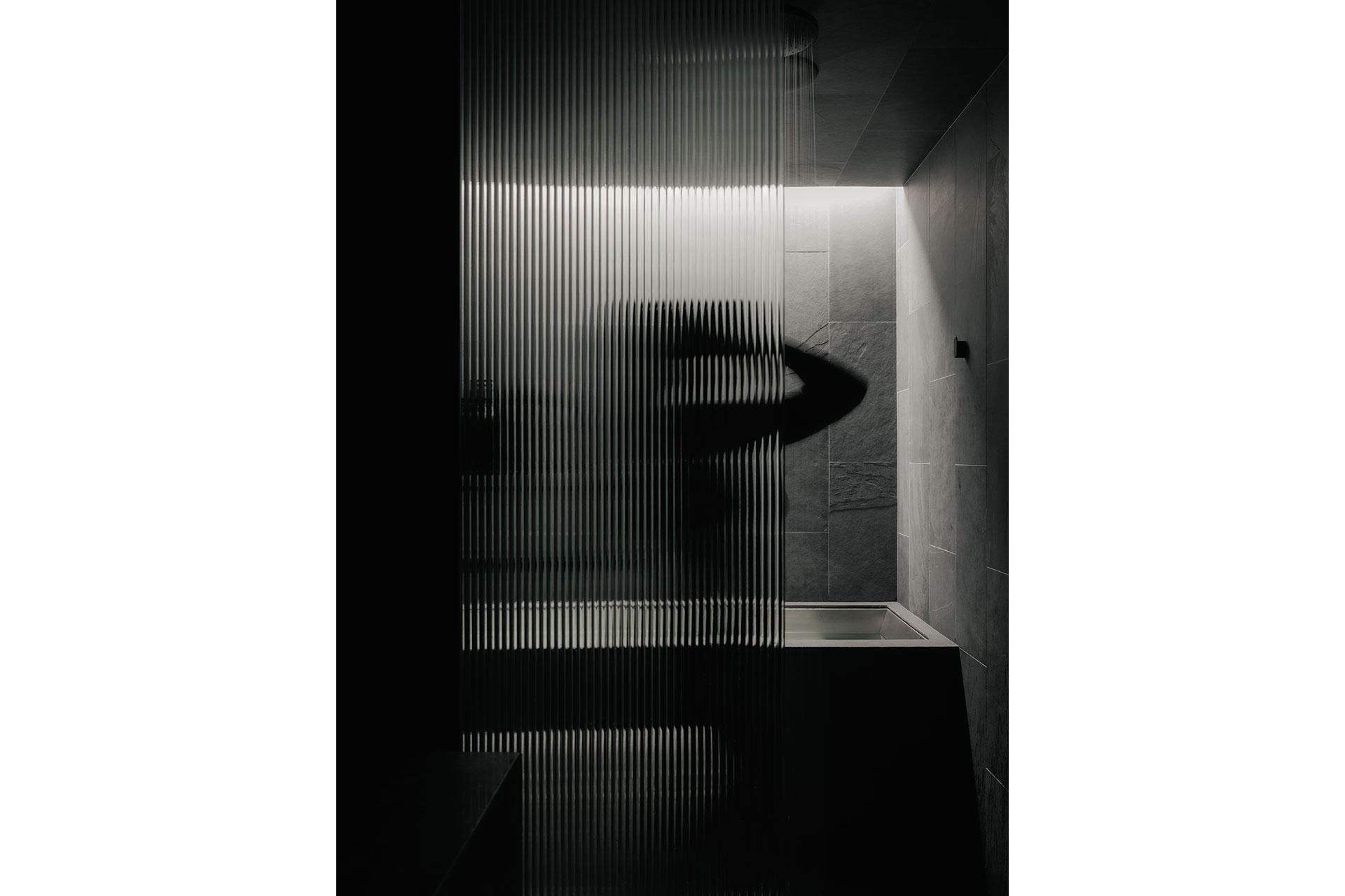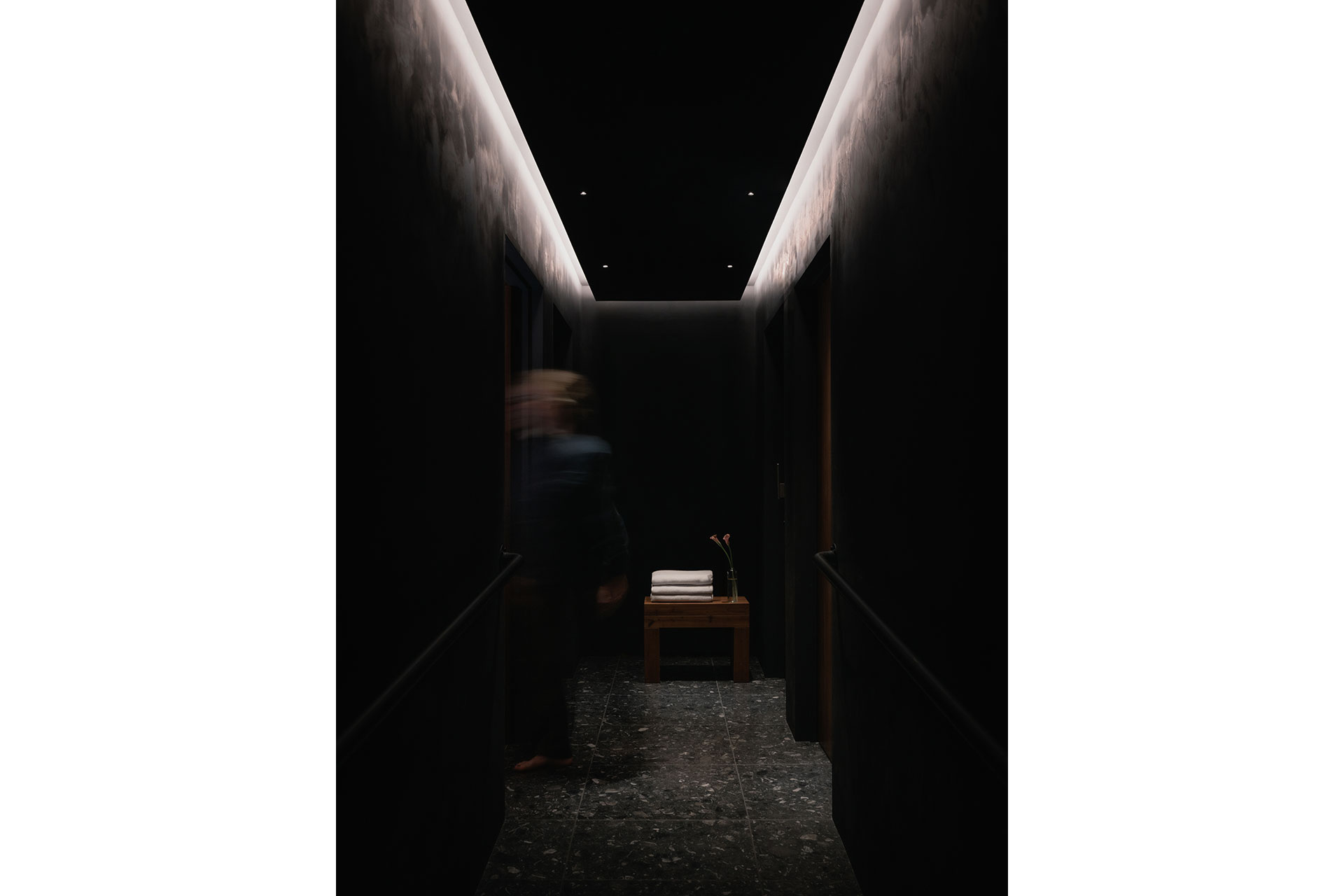 The spatial sequence unfolds as a slow transition from public to private. Upon arrival, a ribbed glass façade diffuses light and obscures direct views, introducing the project through translucency rather than transparency. As guests move inward, illumination compresses and darkens, guiding the body into a quieter sensory register. Corridors, thresholds, and transitions are defined by indirect light and reduced brightness, allowing gradual adaptation and heightened awareness.