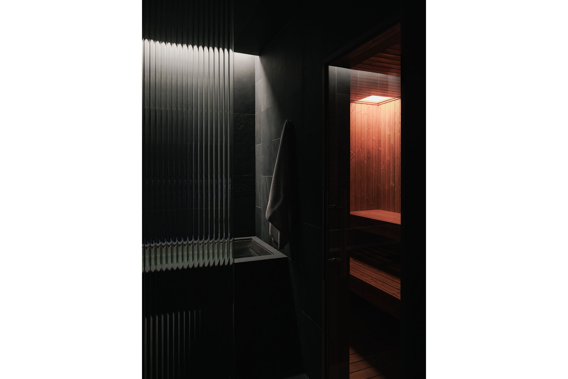 Each individual spa pod is conceived as a personal sanctuary, integrating private ice baths and saunas into a unified ritual experience. Lighting is tuned to support thermal contrast: cool, subdued illumination accompanies cold immersion, while warm, amber tones envelop the body within heat chambers. Glare is eliminated, reflections are minimized, and visual hierarchy is intentionally flattened to reduce stimulation and encourage introspection.