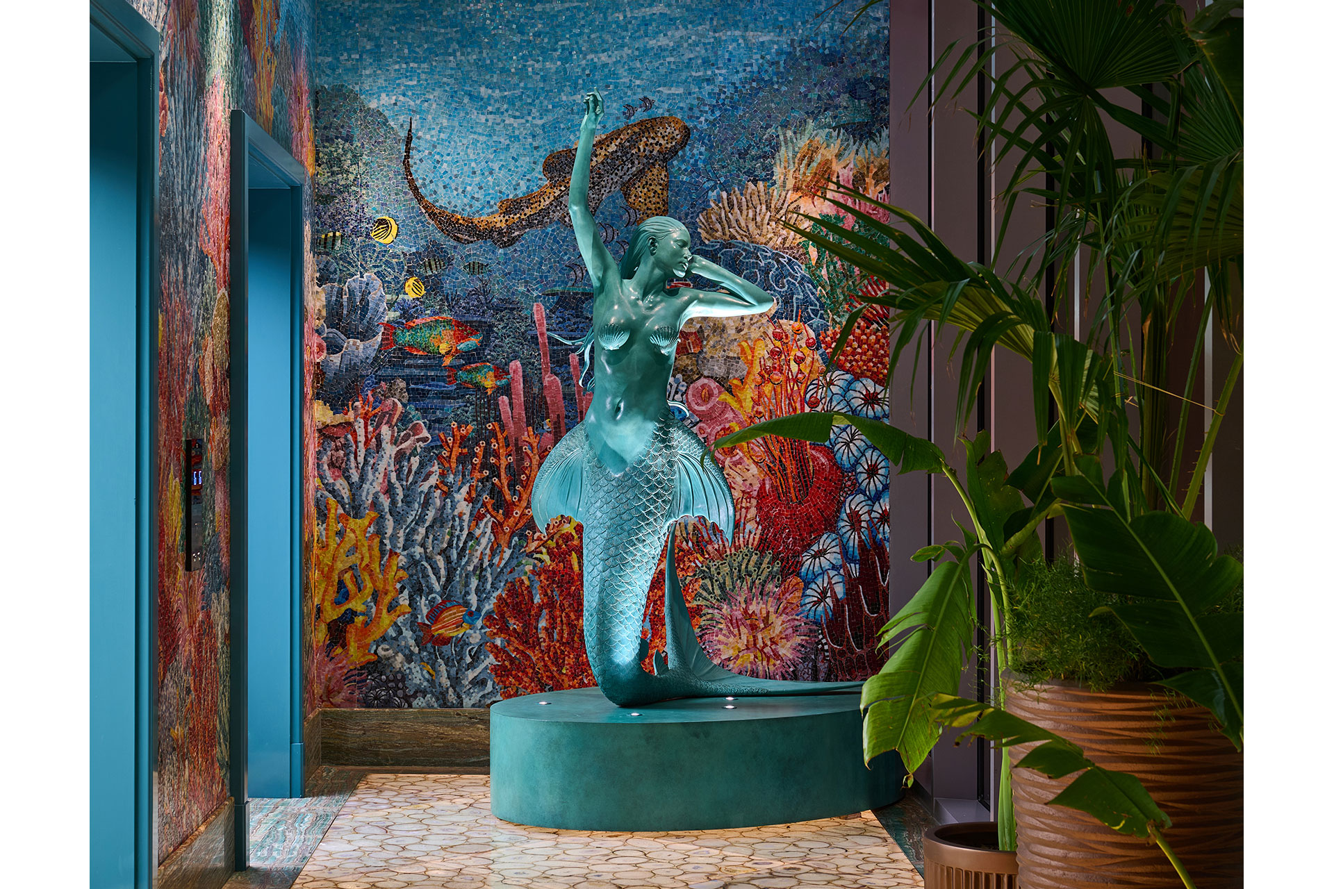 One of the venue’s signature art features, the embossed Damien Hirst relief, is accented with spotlights during the day and transforms into a dynamic canvas through projection mapping at night.