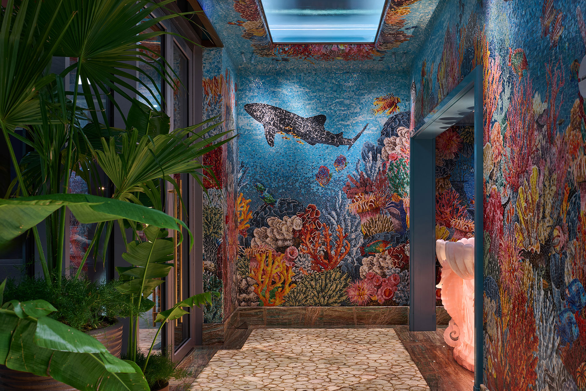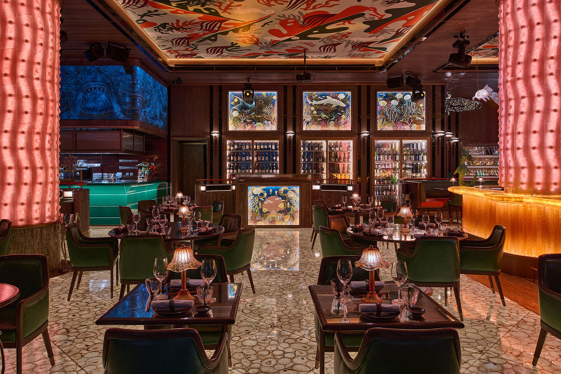 The lighting design is tailored to highlight the venue’s intricate details and artwork while offering a distinct dining experience. Upon arrival, guests are immersed in a mosaic ocean dream, where underwater creatures are softly revealed through delicate accent light and softly glowing floor.