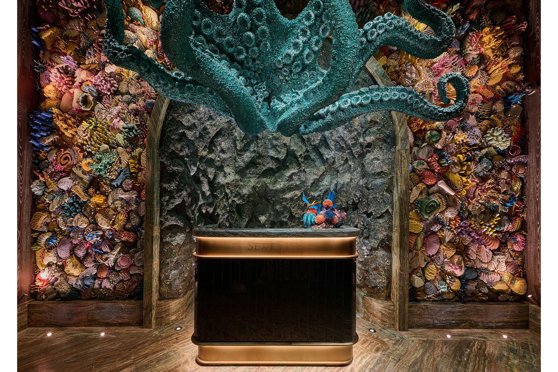 Framed by sculpted cast-glass columns and oversized, edge-lit ocean-themed églomisé panels, Sekushi becomes an immersive sensory experience, where every detail is enhanced through light.