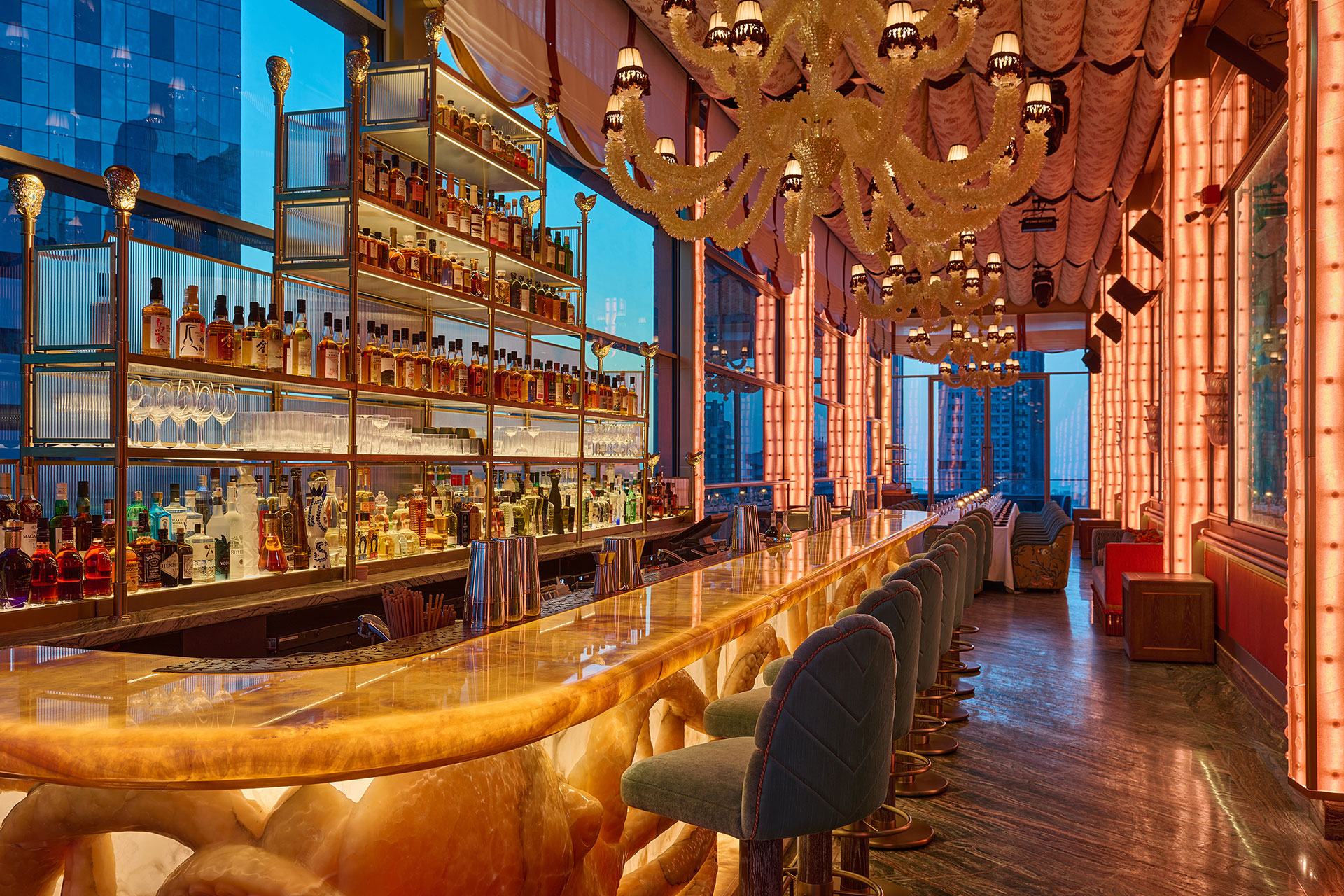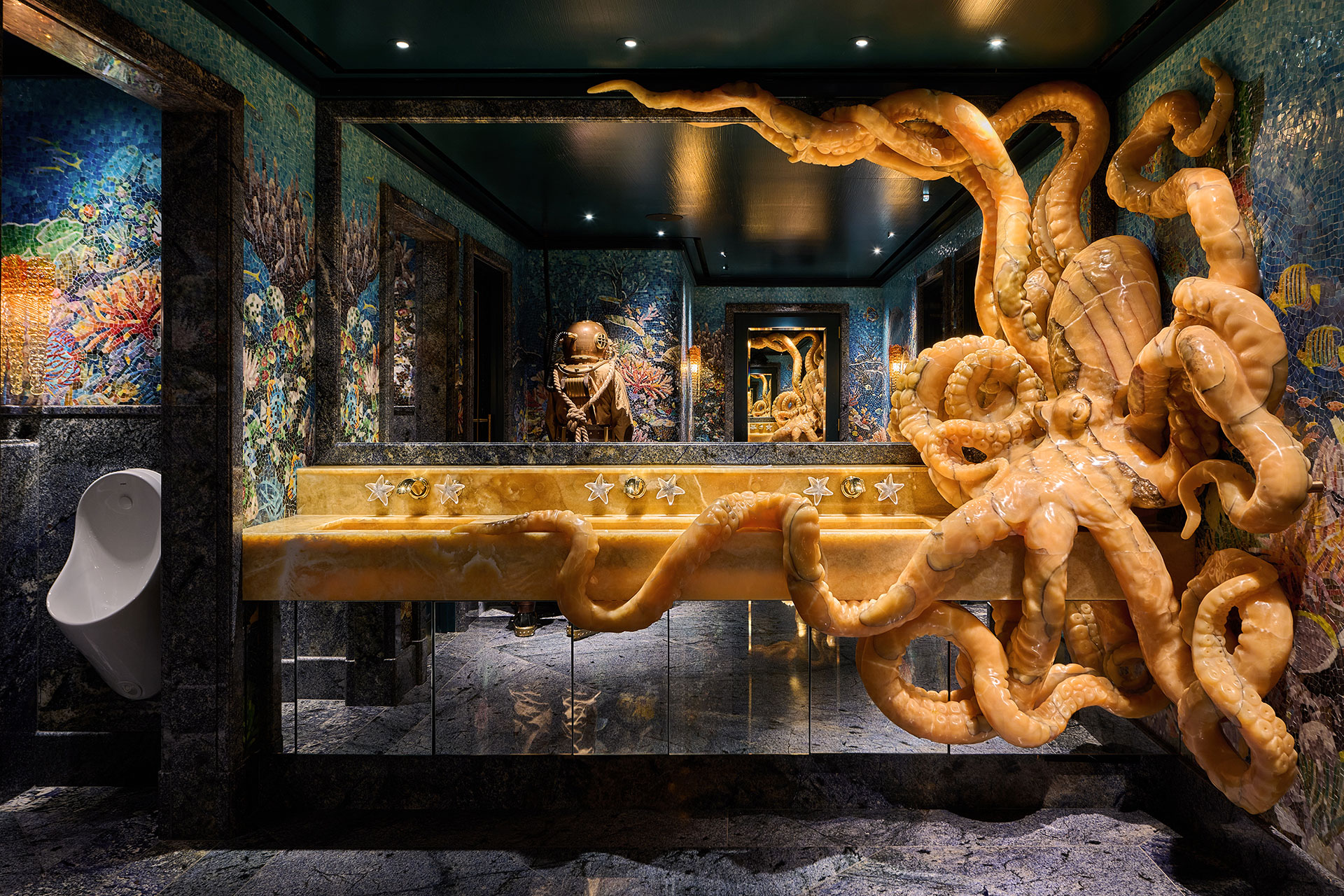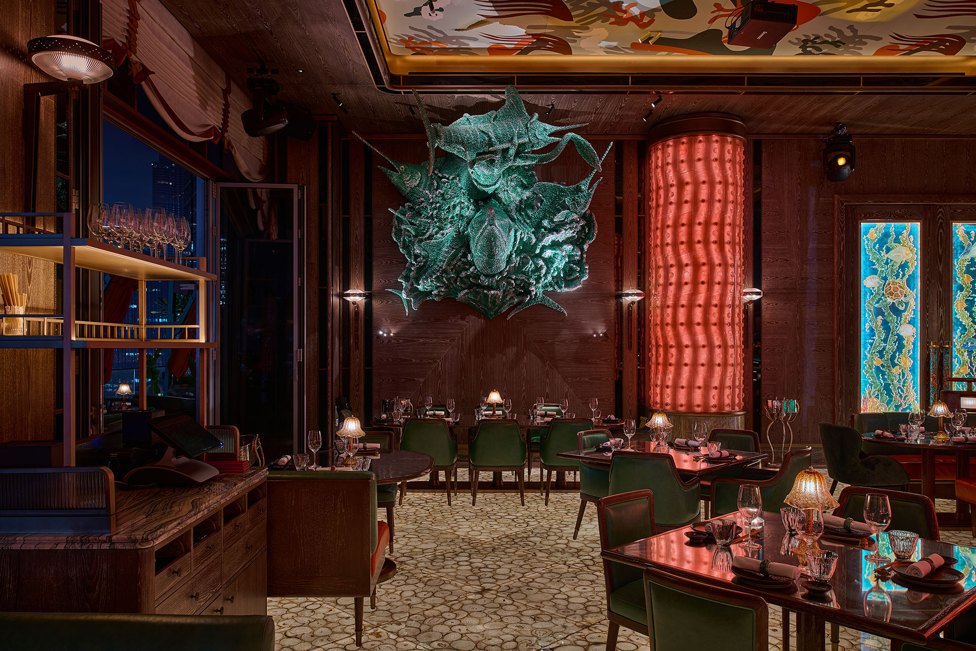 The journey continues on the 11th floor, where a sculptural coral wall and Damien Hirst’s suspended octopus sculpture emerges from its cave, set a very theatrical tone. The lighting was carefully crafted to complement the complexity, textures, and forms of each artistic element. Drama and contrast are the key components to set the tone for the main dining space.
