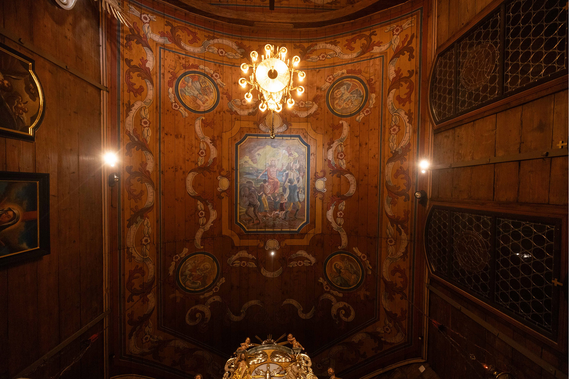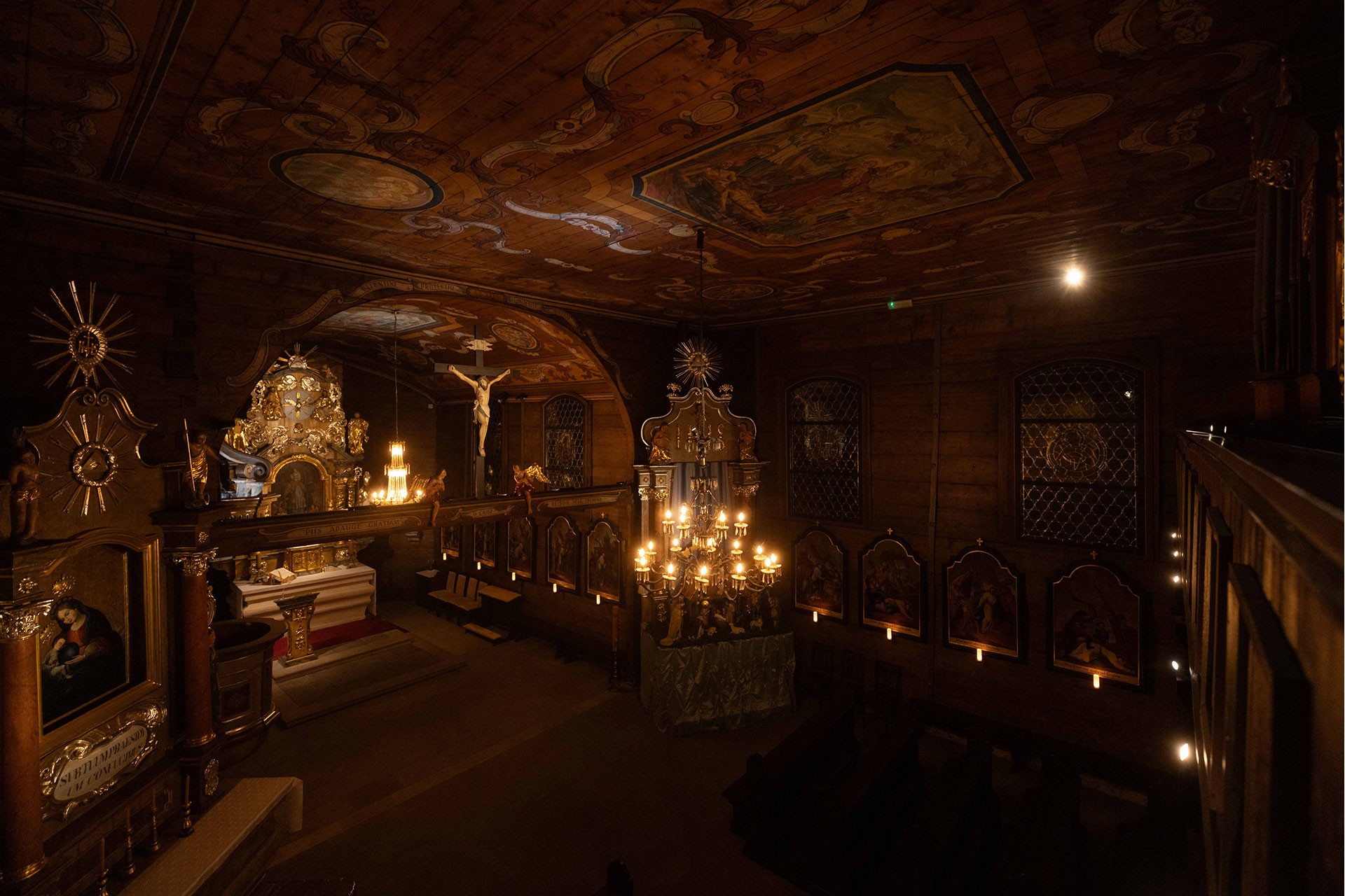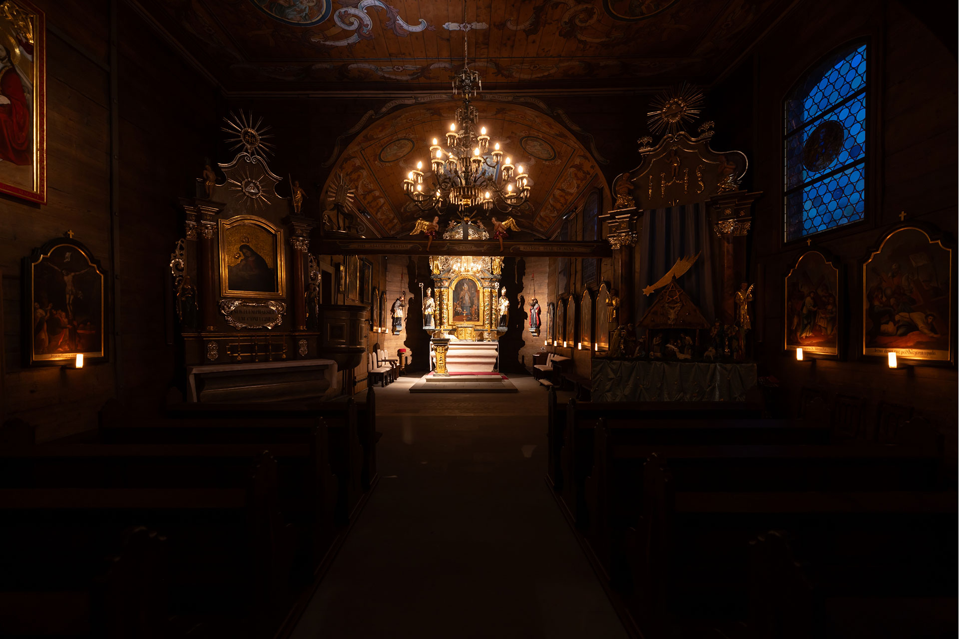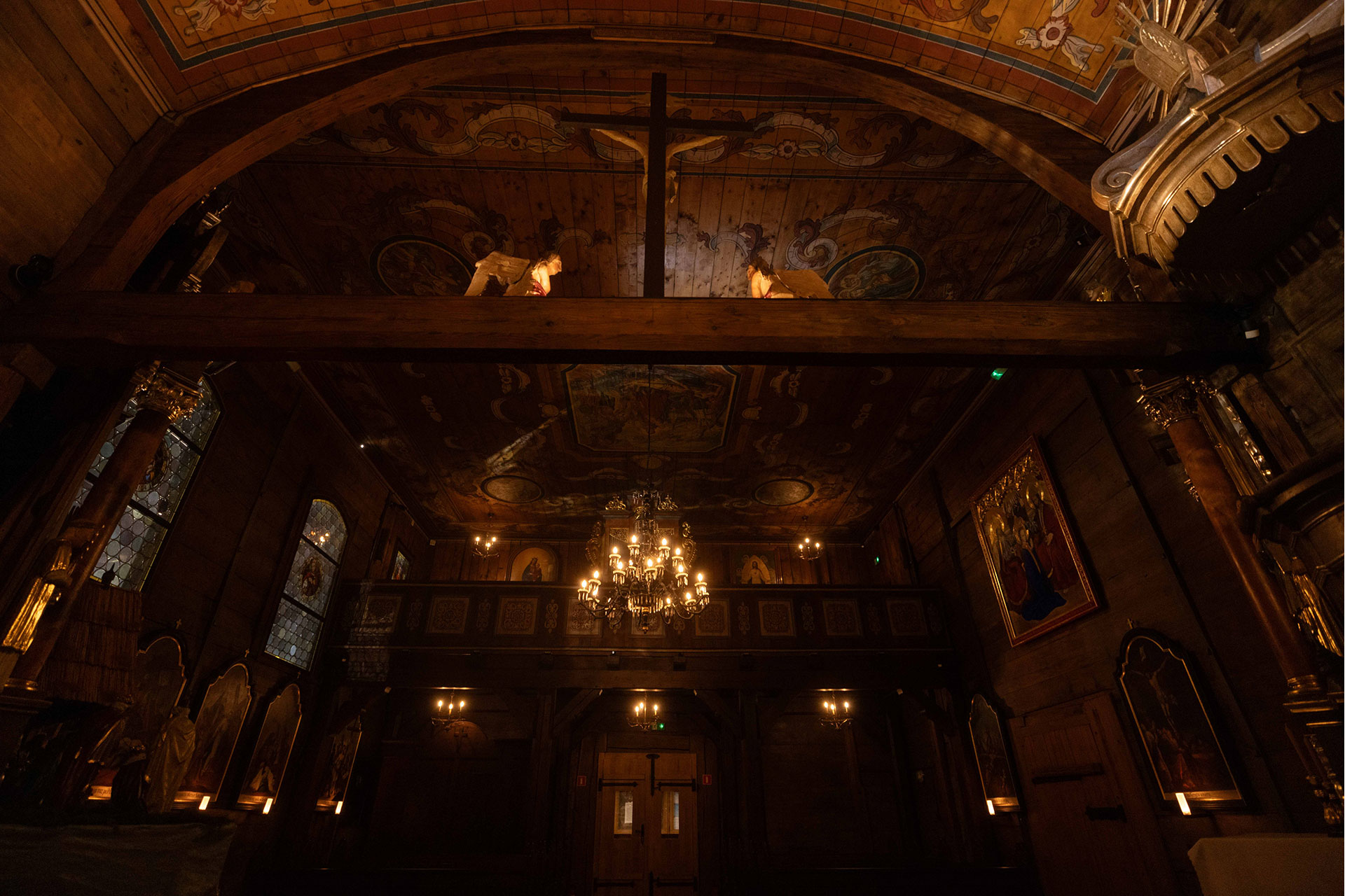 The candle motif is repeated in the chandeliers of the nave and chancel. Cold light (CCT5000K) radiates from above the pulpit, illuminating the paintings on the ceilings and emphasizing the celestial nature of their subject matter. Its presence helps to bring out the warm light of the candles.