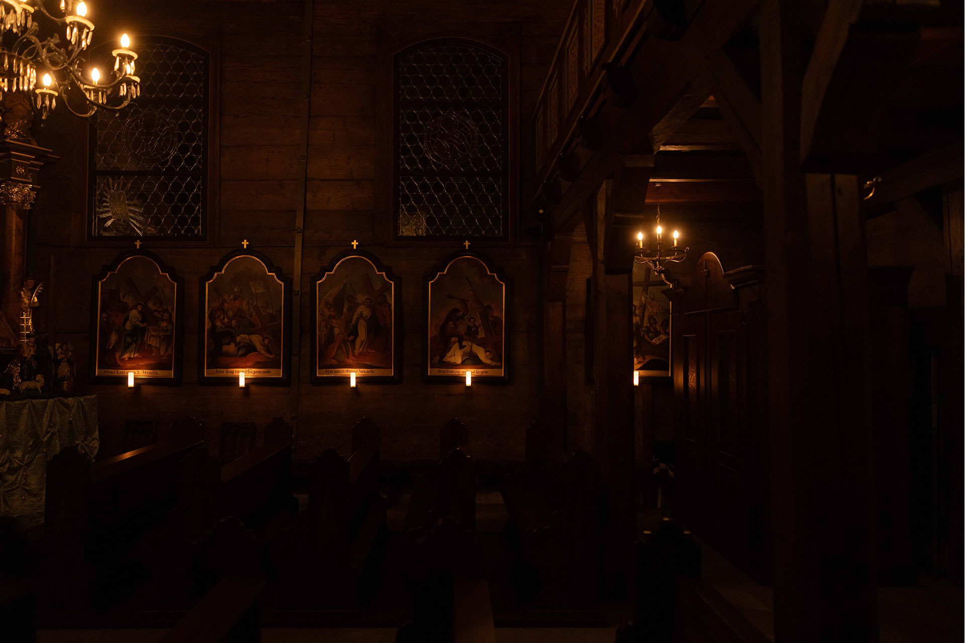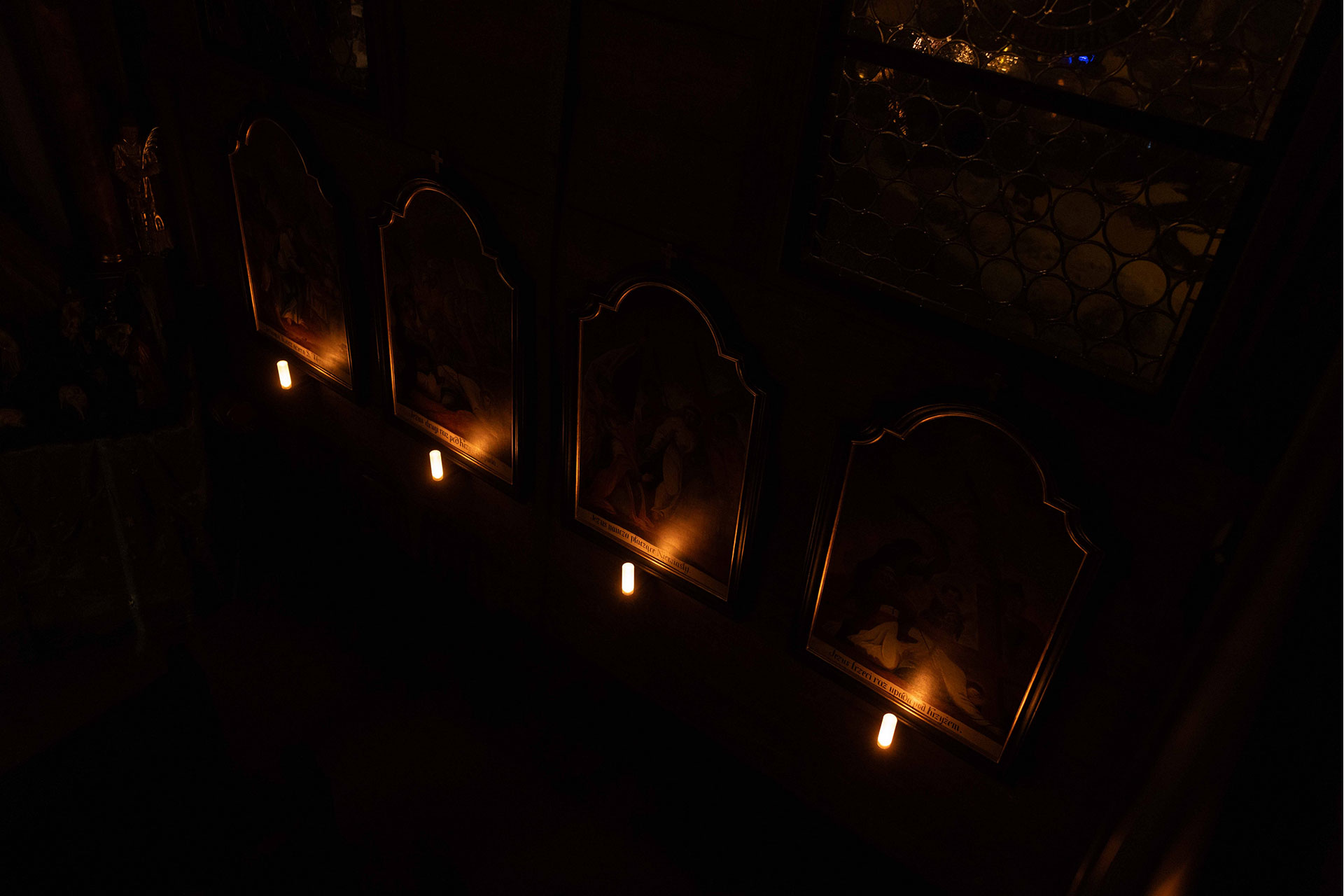 Inside the Sanctuary, in front of each Station of the Cross, lighting fixtures evoking a candle have been designed especially for the building. They emit a warm light (CCT2200K), shining only on the lower part of the image. A museum-like approach to lighting the Stations of the Cross was deliberately avoided, leaving parts of them in semi-darkness, which creates an atmosphere of concentration and contemplation and refers to the atmosphere of the 17th-century interior.