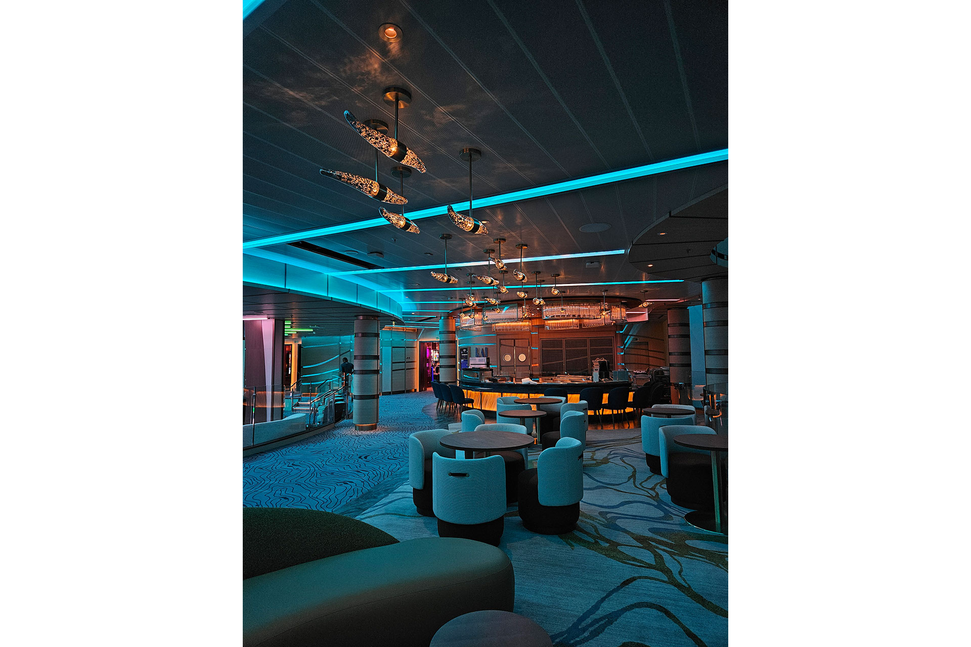 The Piazza is designed for adaptability. During the day or between performances, lighting remains neutral, with subtle movement and soft color accents. At night, as shows begin, walls and ceilings come alive with color, motion, and effects, drawing guests into the action. Video content can be mapped directly onto the pixel nodes, allowing the room itself to complement imagery on the main screens. Tiny DMX-controlled spotlights in the ceiling highlight decorative fins leading to the chandelier, adding sparkle to the glass. Six deck-to-ceiling columns flanking the atrium are backlit with pixel control panels, and custom RGBW fixtures are embedded into bulkheads on every deck. Dining and beverage areas remain in static warm white, grounding service zones and differentiating them from performance spaces. The result is a fully customizable venue capable of transforming for shows, themed cruises, or special events, ensuring a unique experience on every voyage.