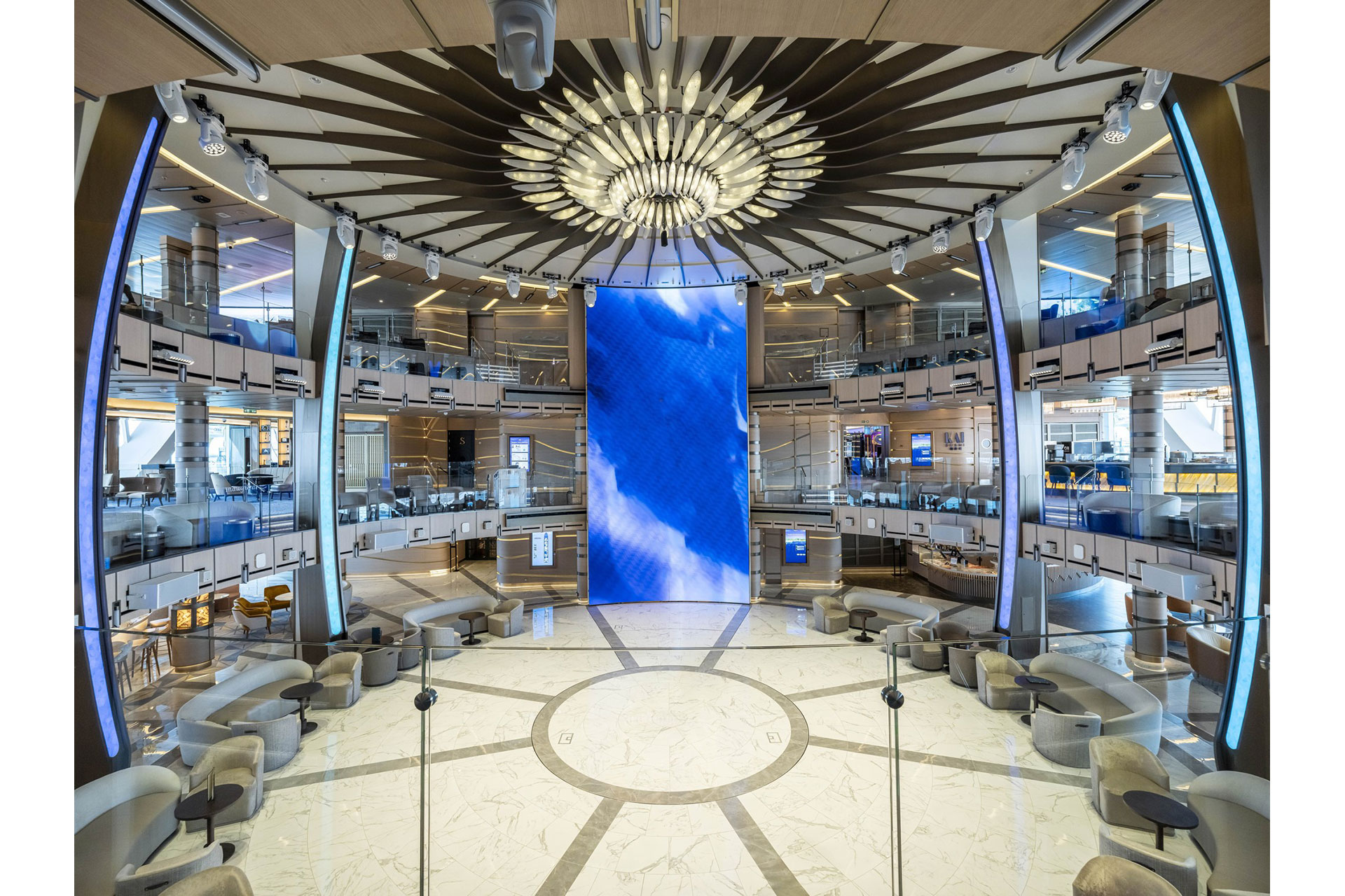 At the core of the Piazza’s magic is its control system. An ETC Atlas Pro coordinates dynamic lighting and entertainment effects, working with the ship-wide Helvar system to blend architectural lighting with pixel-controlled elements. During performances, the entertainment system separates pure architectural lighting from architainment elements, locking service-area lighting in place while sending multilayer video signals from the media server to the pixel map. This allows the entertainment team to fully animate the atrium, transforming it into a living performance space.