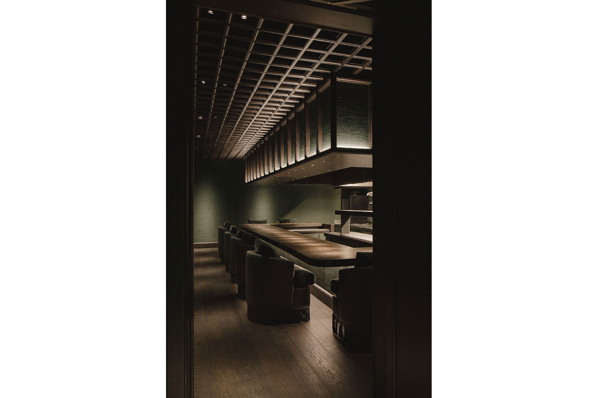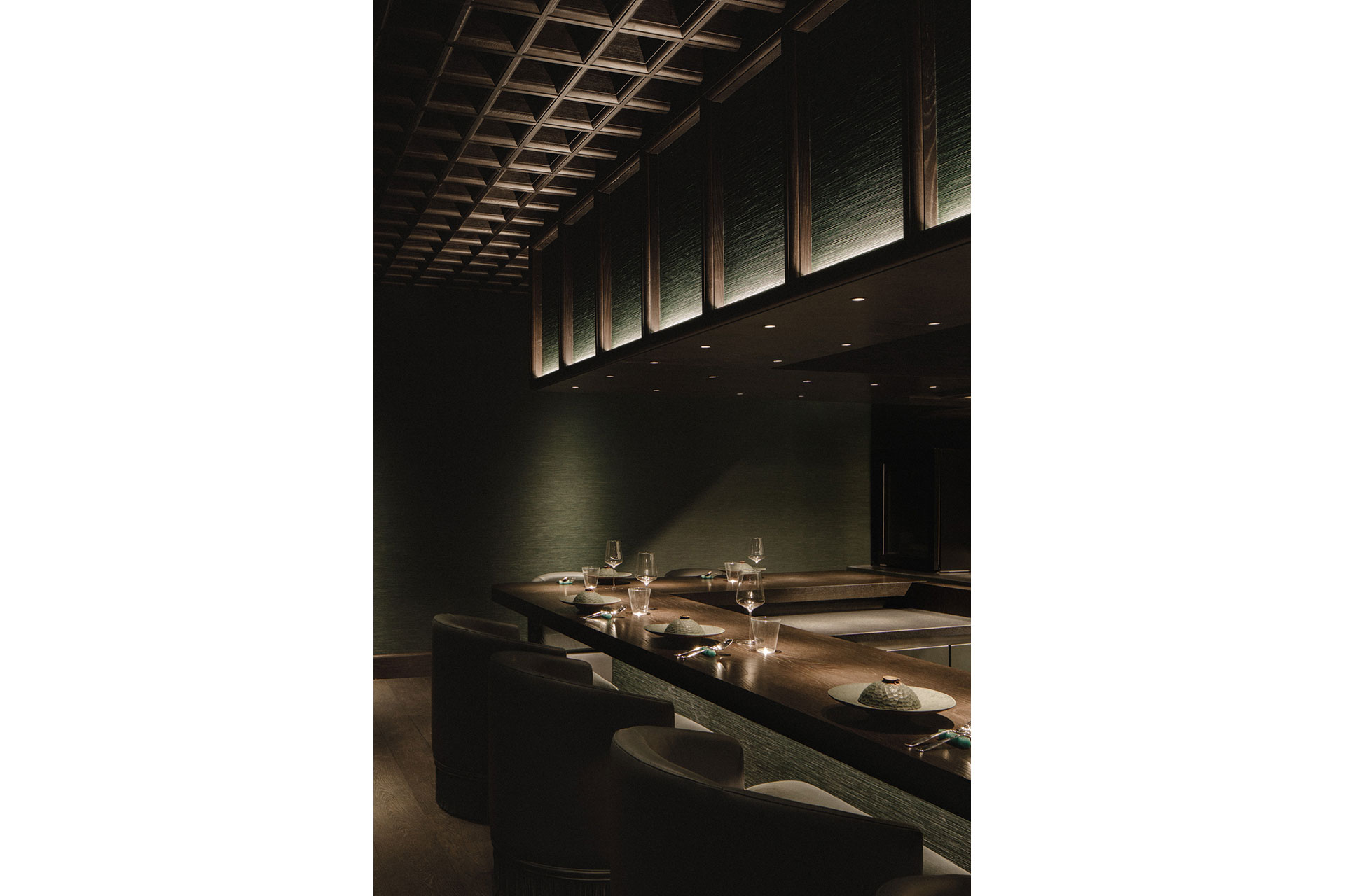 Light is applied with precision, illuminating the ritual of dining rather than the space itself. Each seat is framed by intimate warm light, directing attention to the food, the hands, and the shared experience around the table and the chef.