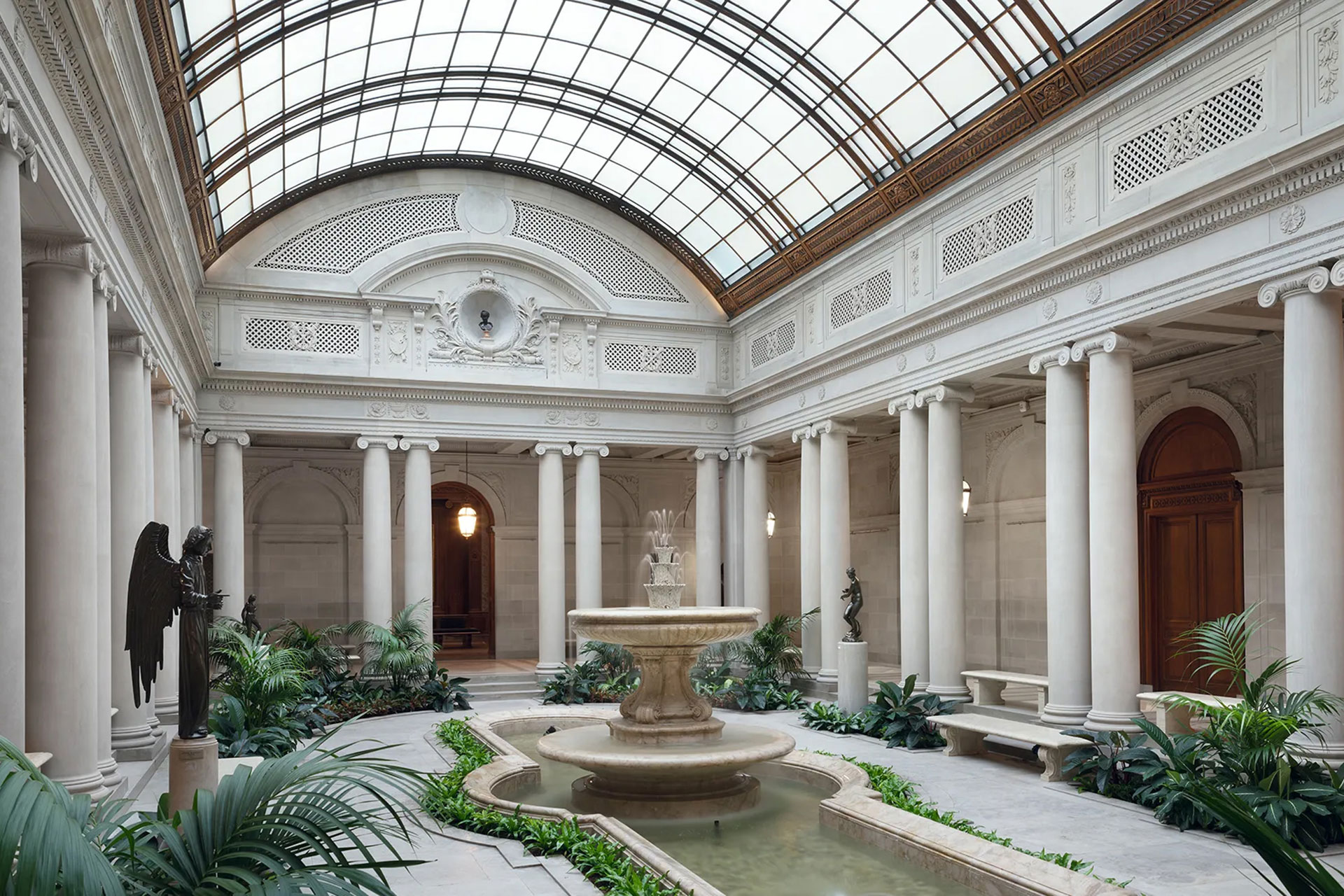 In the Garden Court, discreet miniature spotlights were added to restored historic lanterns to illuminate sculptures located in wall niches previously in shadow. New miniature LED accent lights were also integrated into most of the refurbished historic chandeliers in the new second-floor galleries—spaces previously not open to the public that now serve as added art galleries.