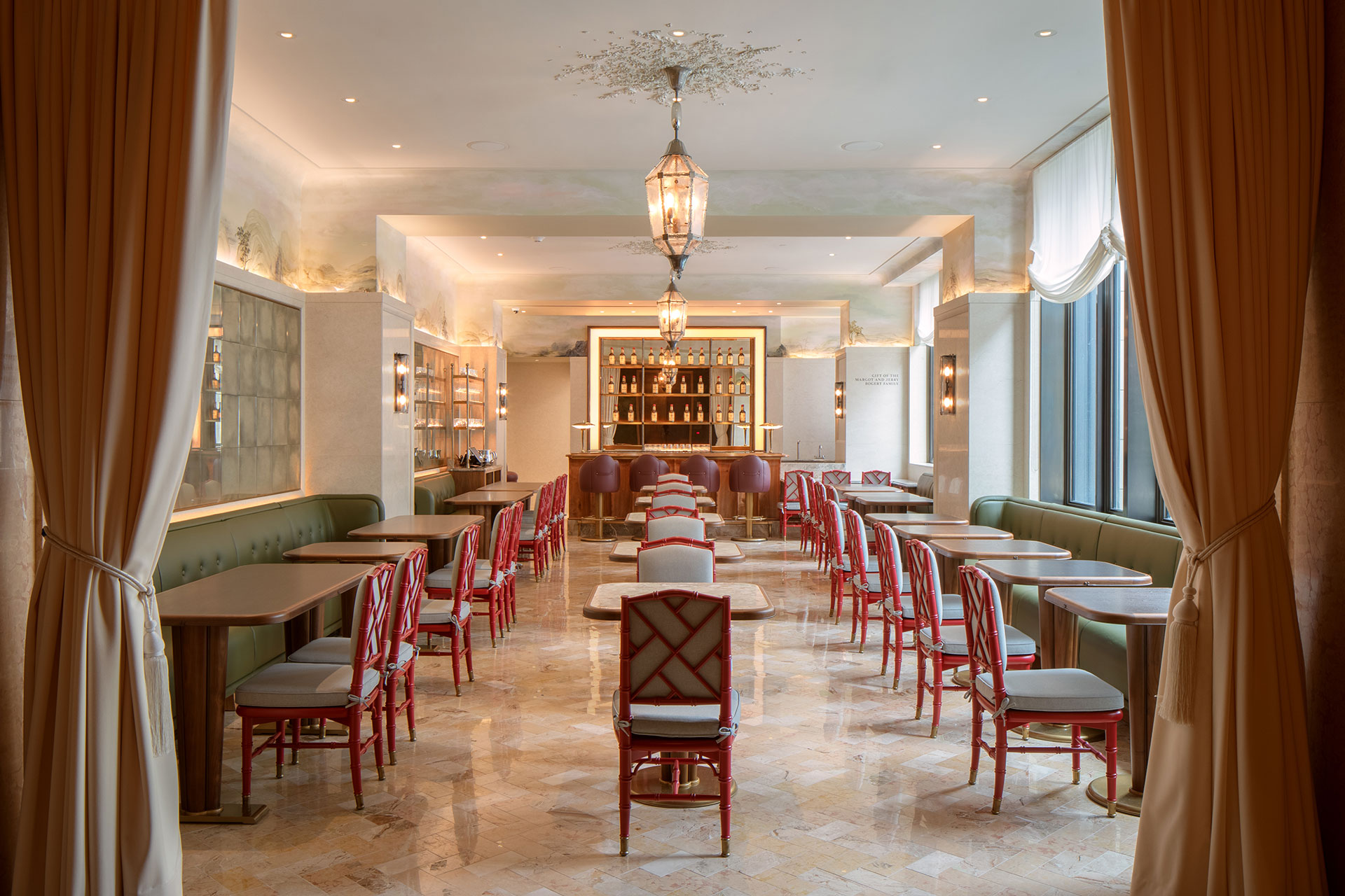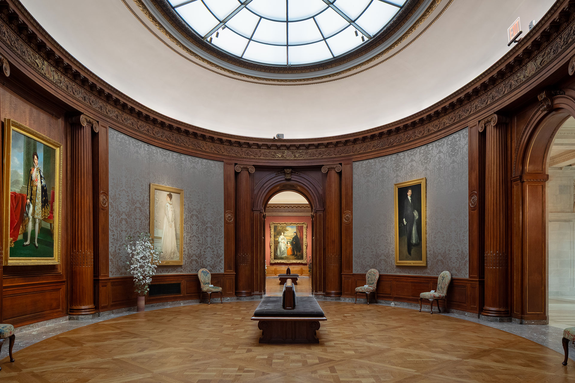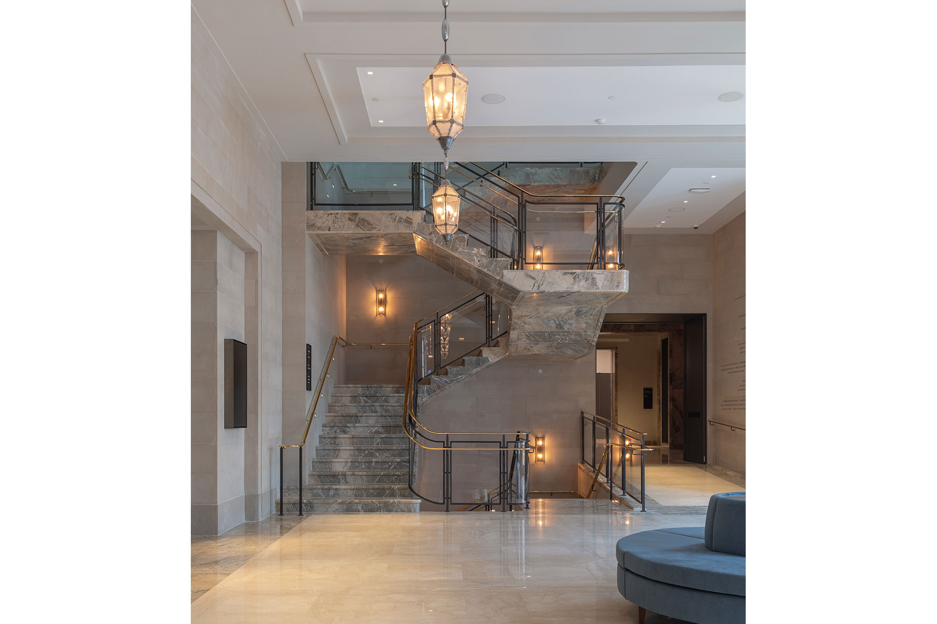 Across the museum, color temperature and light consistency were recalibrated to bridge the intimate experience of the Gilded Age home with the demands of contemporary exhibition. New picture lighting was developed in collaboration with Steven Weintraub to optimize spectral output for conservation and display. Decorative lighting—such as bronze and Murano glass lanterns in the reception hall—was tuned to preserve a warm, residential ambiance. Sconces on the new blue Breccia Aurora marble stair softly emphasize the stone’s texture and tone.