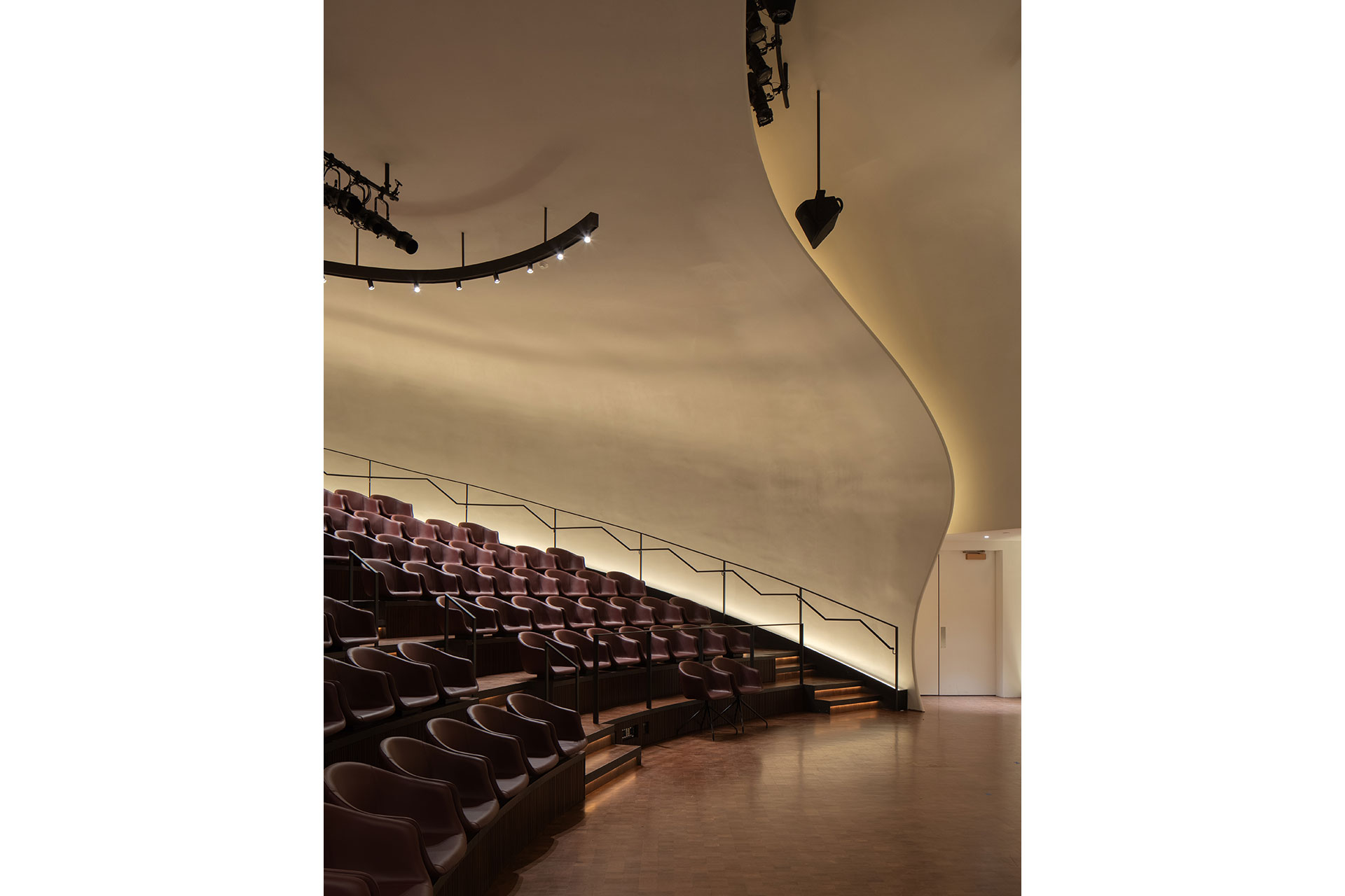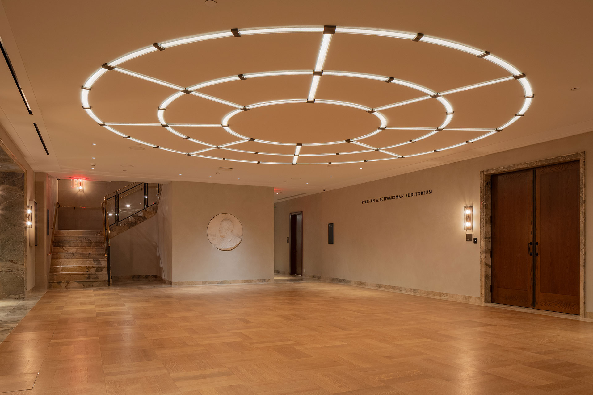 Lighting also supports the museum’s new program areas. In the new lower-level auditorium, integrated base lighting emphasizes the curved, hand-plastered surfaces and enhances the immersive quality of the space. A suspended rig provides zoned illumination for the audience area while minimizing impact on the architectural volume. The anteroom features a striking graphic fixture, with textured Murano glass panels backlit by a ceiling-recessed lighting slot, that traces the plan of the original circular music room on the ground level.