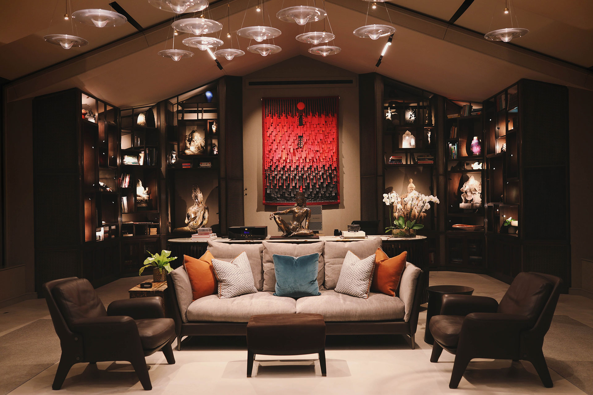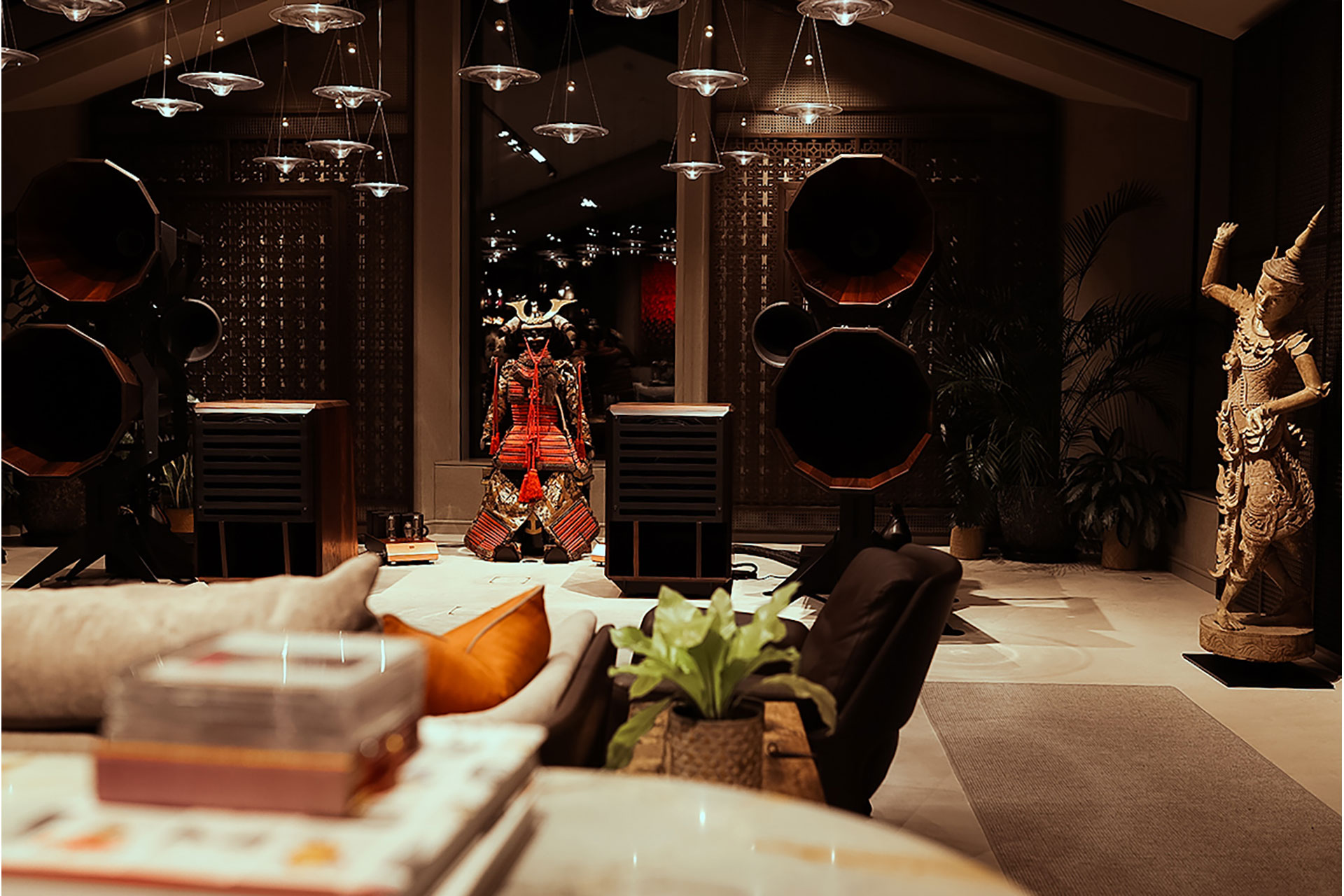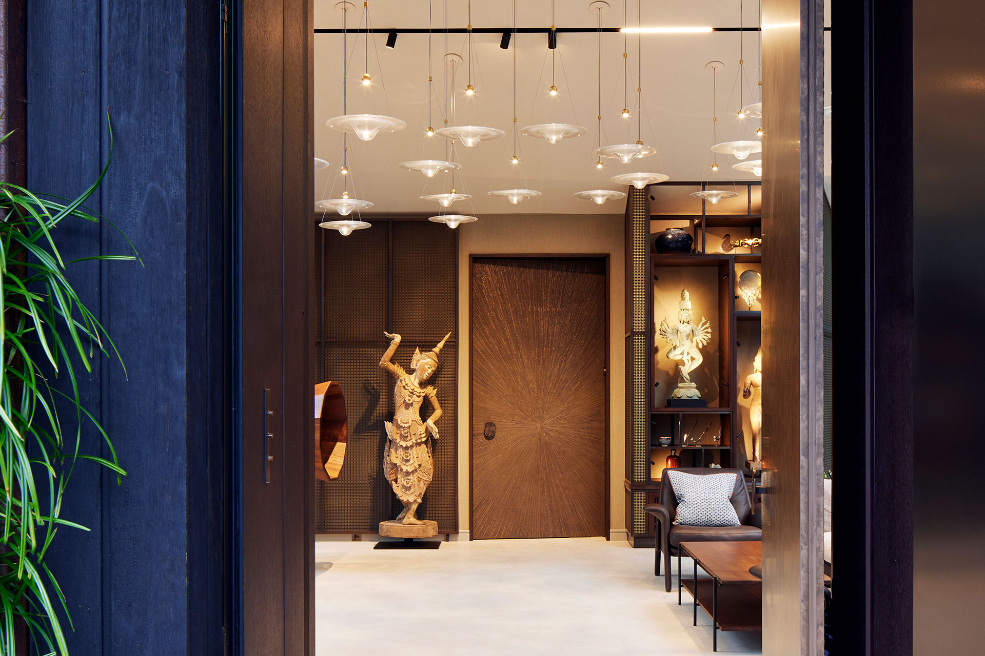 Light drops from above – thirty-two glass pendants ripple in a measured soundwave across the room. Made by Venetian artisans, they function less as decoration and more as instruments, translating movement into light. Around them, ancient artefacts sit in the joinery, each defined by its own contained pocket of light.