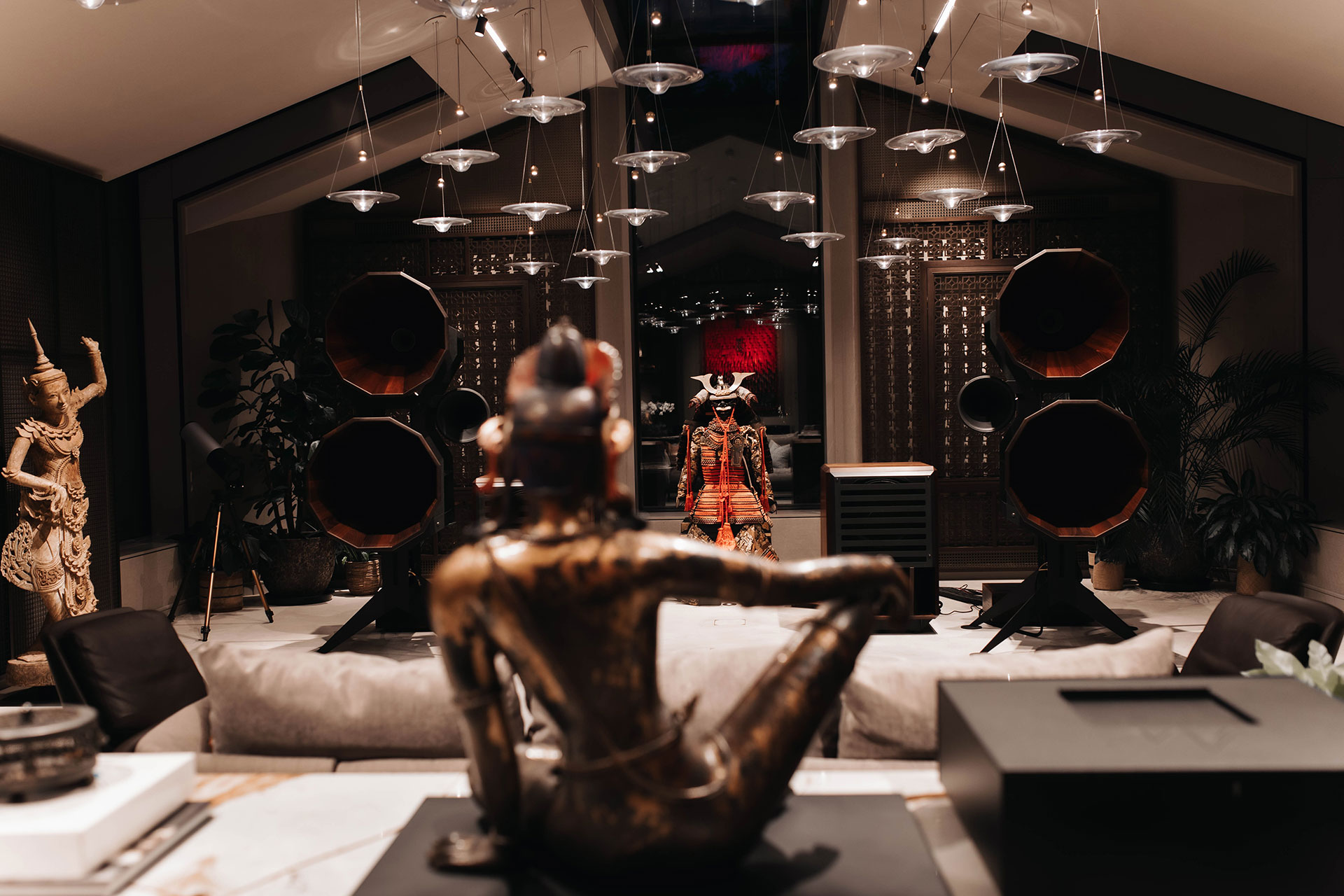 Lighting played a pivotal role in shaping the pavilion’s identity. Ideaworks developed a layered lighting strategy to suit the multifunctional nature of the space – ideal for working, entertaining, and deep listening. A bespoke 32-piece Wonderglass pendant display creates a sculptural centrepiece, casting ripple-like shadows evocative of sound waves. Miniature track lighting, integrated into custom joinery, highlights the client’s artefact collection with precision and discretion.