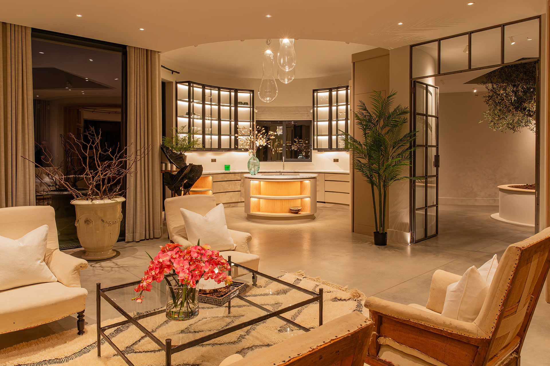 The large areas of glazing were both a highlight and a challenge, and were considered throughout the design. We developed custom, one‑off automated curtain tracks for the big runs of glass and tied them into the lighting controls. Blinds, curtains, and lighting work together to shift the mood through the day and help the house flow naturally between inside and out.