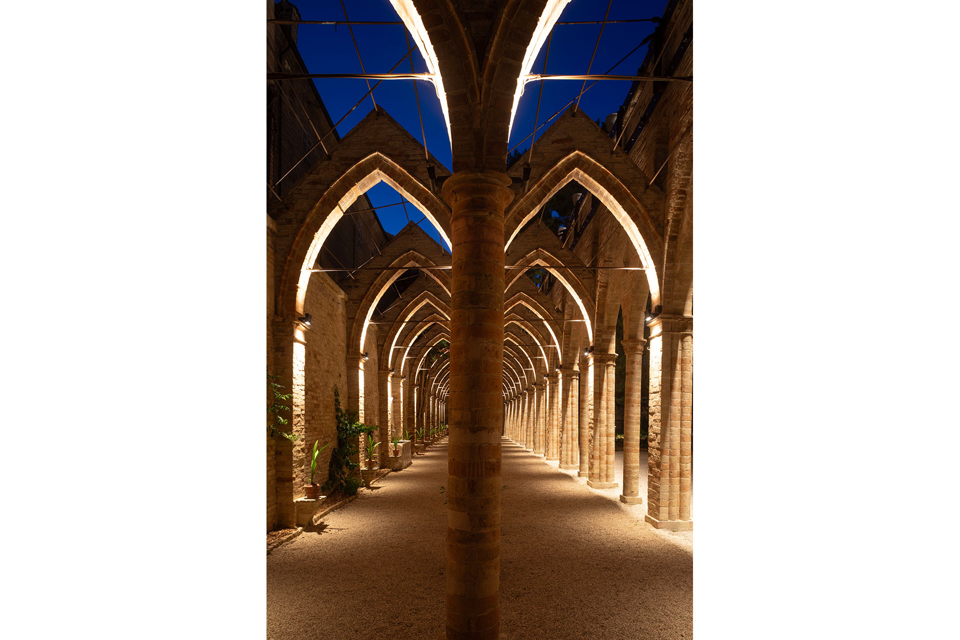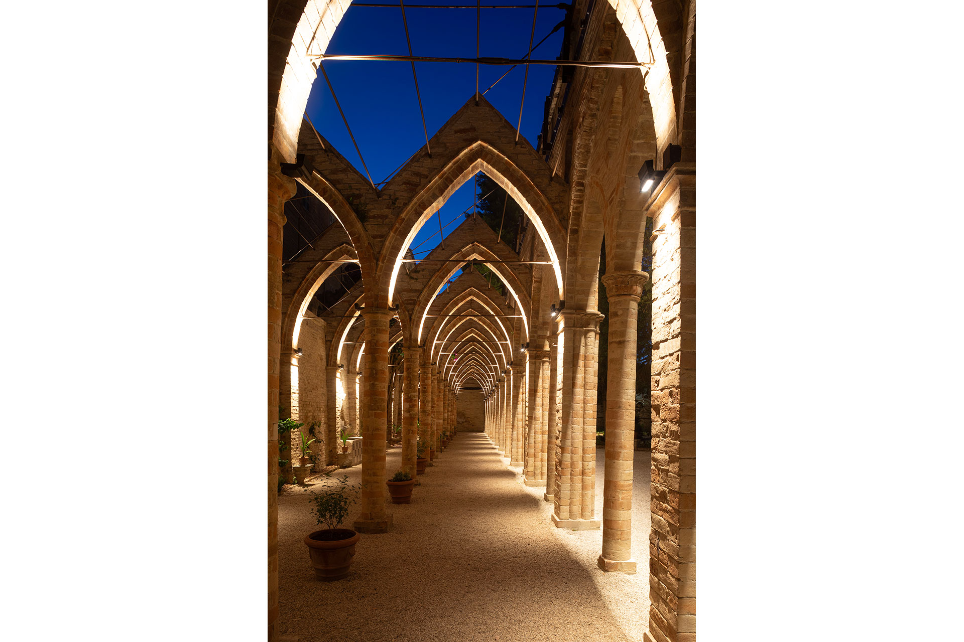 A variety of LED luminaires were used with different colour temperatures: 2700K for the warm greenhouse and the Gothic arches inside the cold greenhouse, and 3000K for the pathways and the Gothic façade of the cold greenhouse. All fixtures are equipped with a DALI system for precise light output control, complemented by a management system to create dynamic lighting scenarios. These solutions ensure seamless integration with the existing architecture (cold and warm greenhouses) and landscape design (flowerbeds and pathways), enhancing both form and atmosphere.