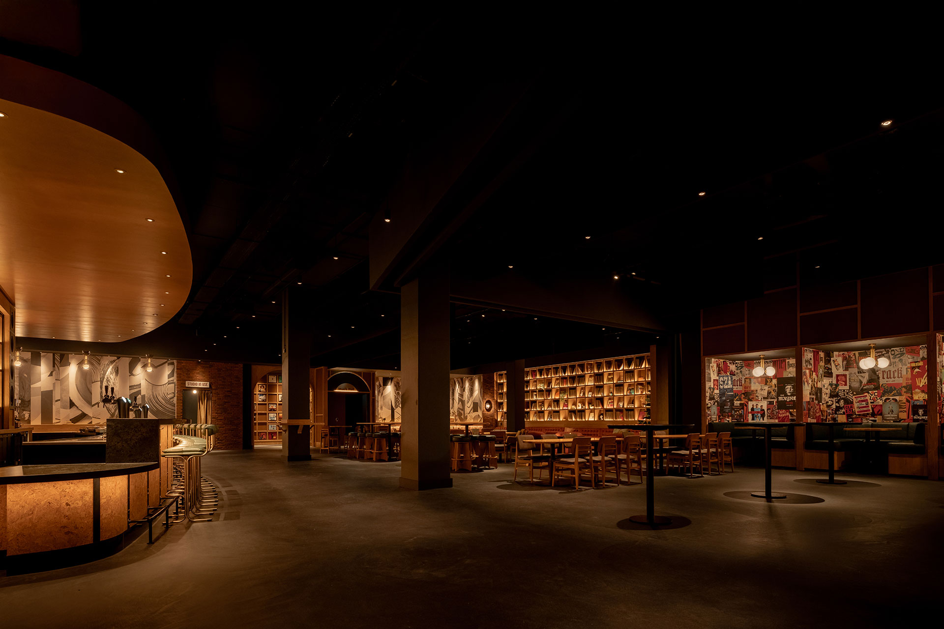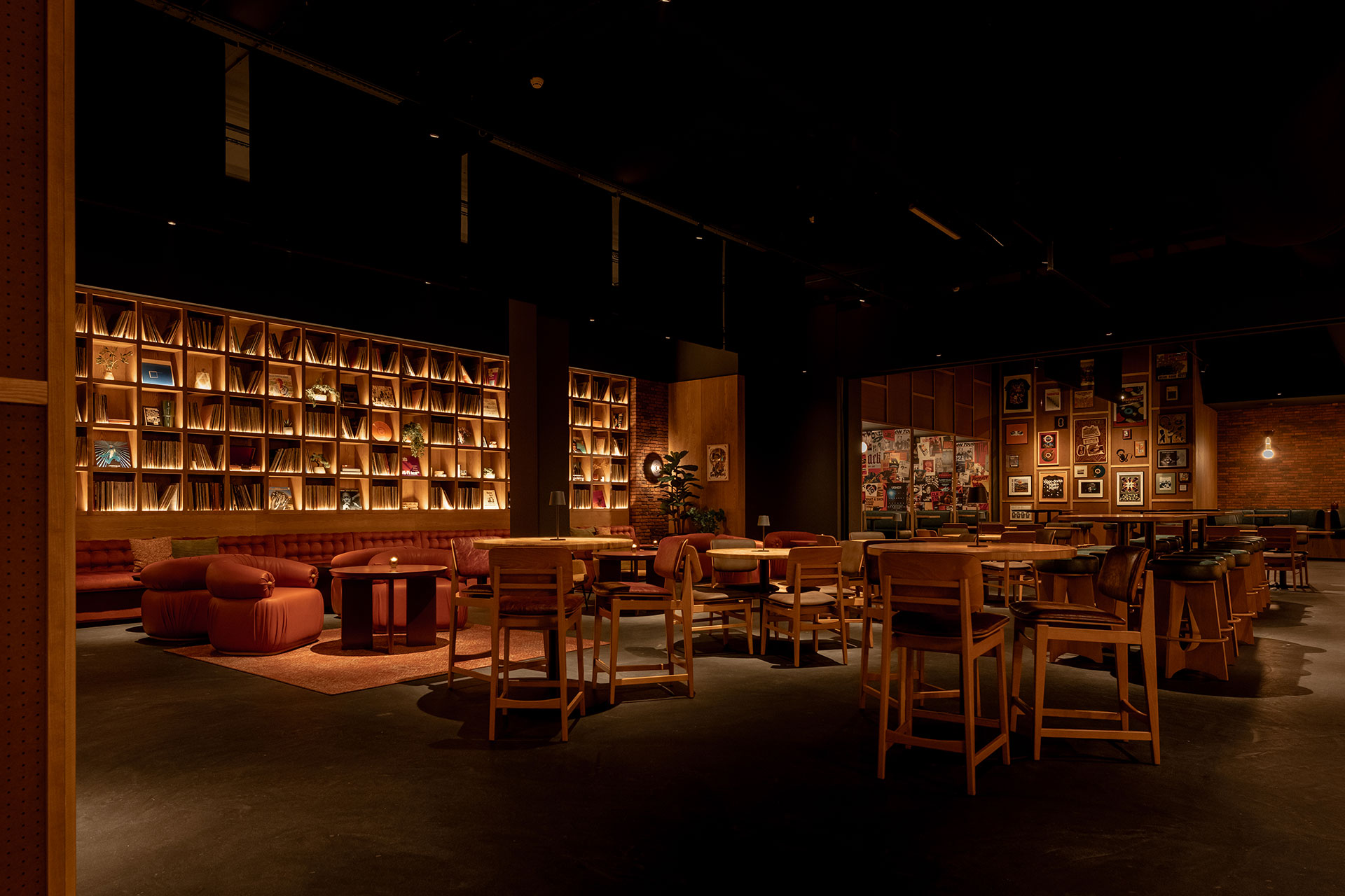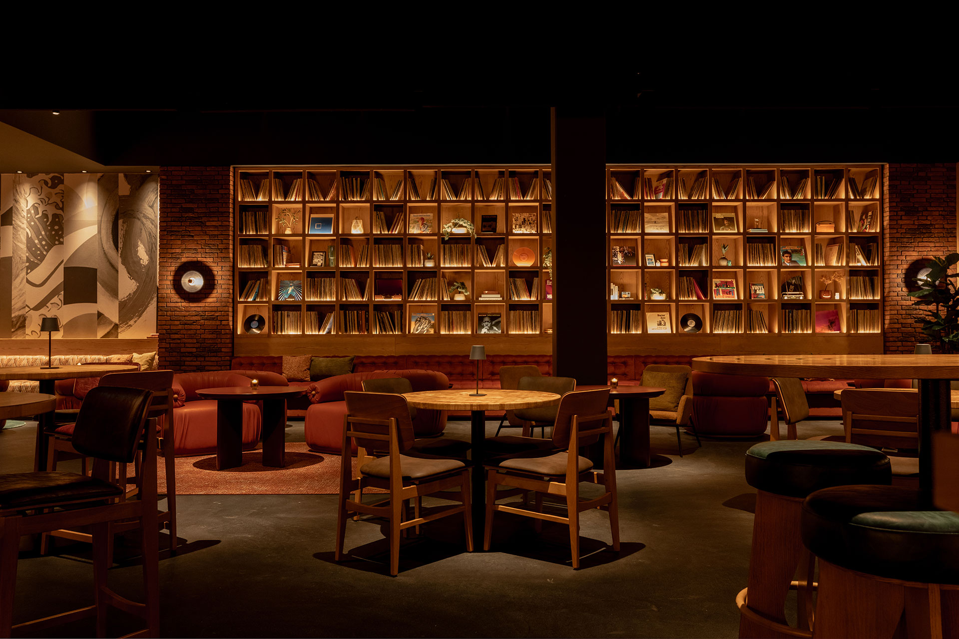 Lighting plays a pivotal role in shaping the Vinyl Room’s atmosphere and reinforcing its listening-focused concept. A layered lighting strategy is employed throughout the space, combining soft ambient illumination with subtle accent lighting to create depth and intimacy. Warm, low-level light washes across textured walls and shelving, gently highlighting vinyl collections and architectural details without overpowering. Carefully positioned spotlights and concealed LED draw attention to key elements—such as the back bar shelving, poster walls, and booths while maintaining an overall warm glow. This interplay of light and shadow allows surfaces and materials to reveal their richness gradually, encouraging guests to slow down and settle into the space. By avoiding harsh contrasts or dynamic effects, the lighting supports a relax atmosphere, creating pockets of light that make each seating area feel personal and cocooned. In doing so, lighting becomes an integral part of the Vinyl Room’s sensory design, shaping mood, guiding movement, and enhancing the emotional connection between space, sound, and listener.