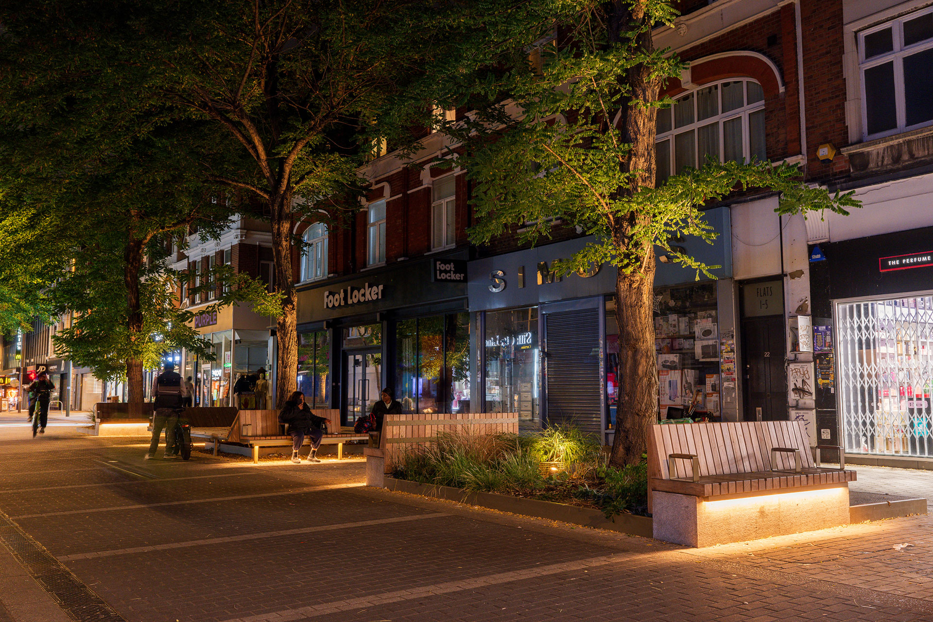 Key pedestrian routes are subtly lit to improve visibility and comfort, supporting natural movement through the space. Along Powis Street, the lighting introduces warmth and continuity, strengthening connections between the square and the wider town centre. The overall effect is a public realm that feels open and accessible, while remaining visually coherent and uncluttered.