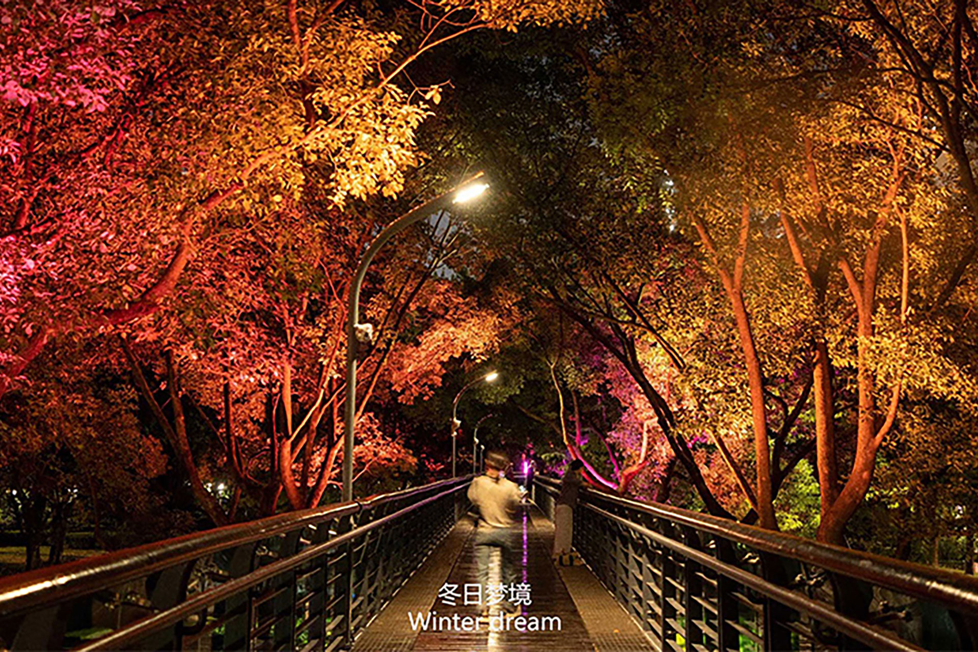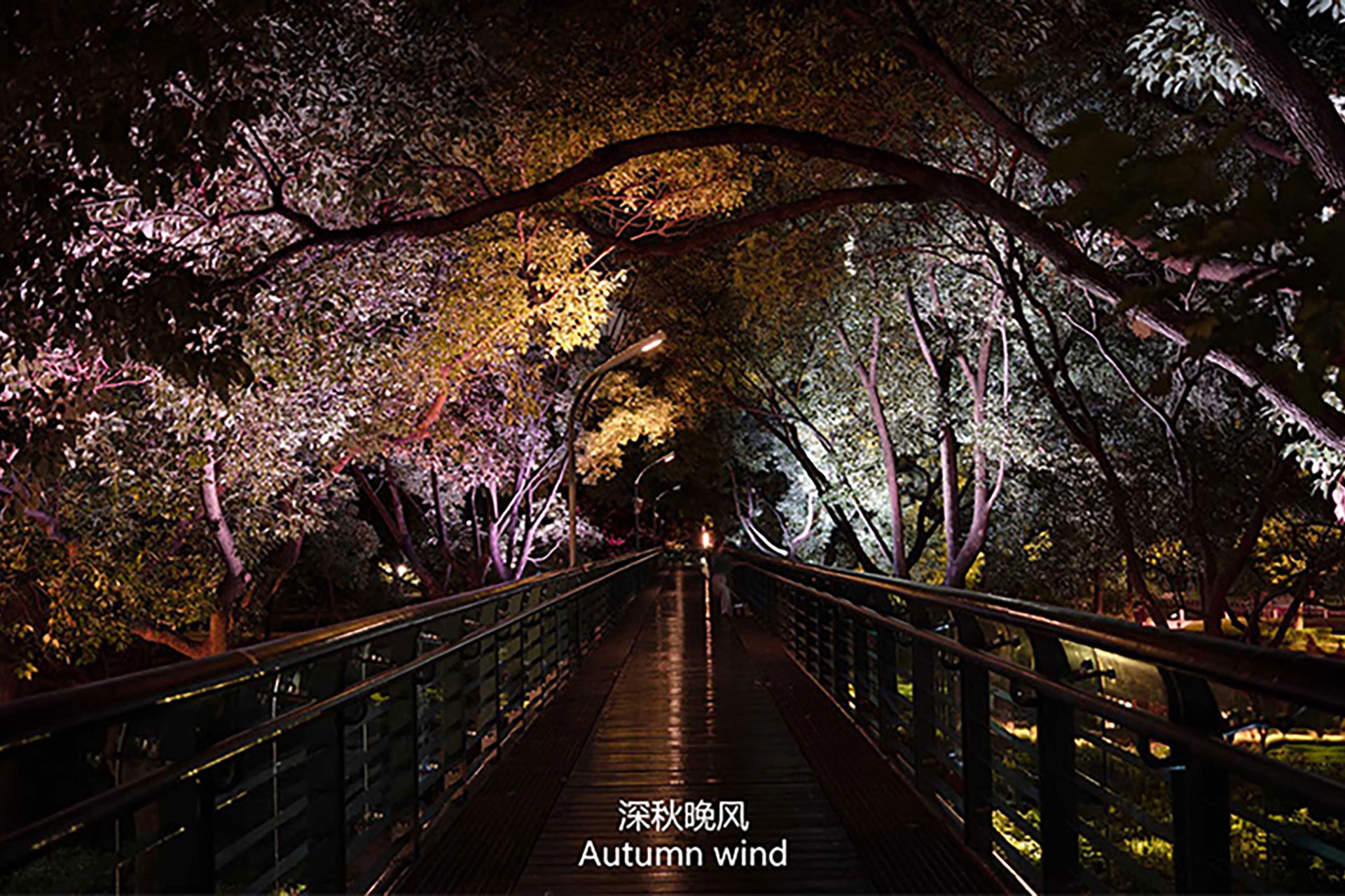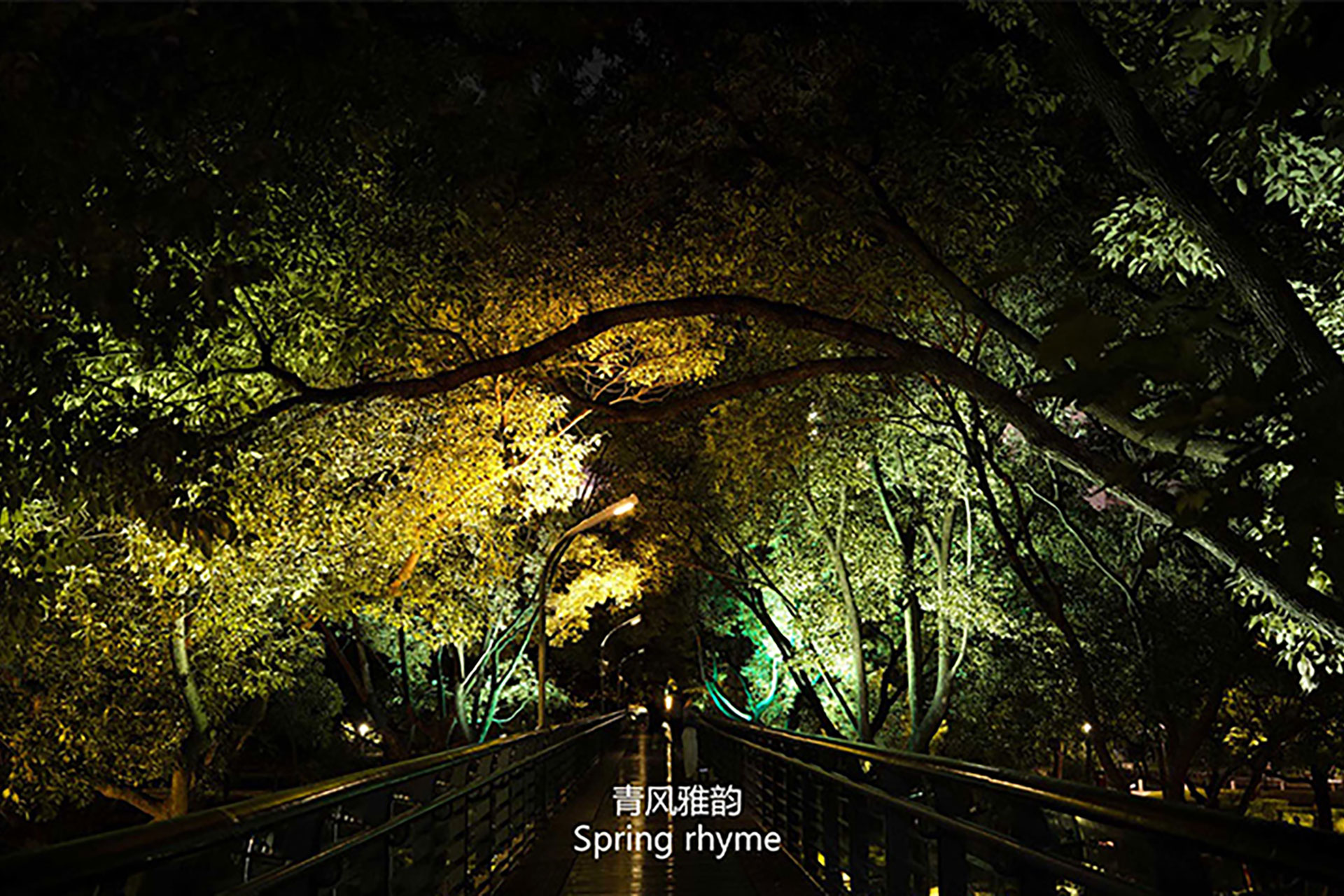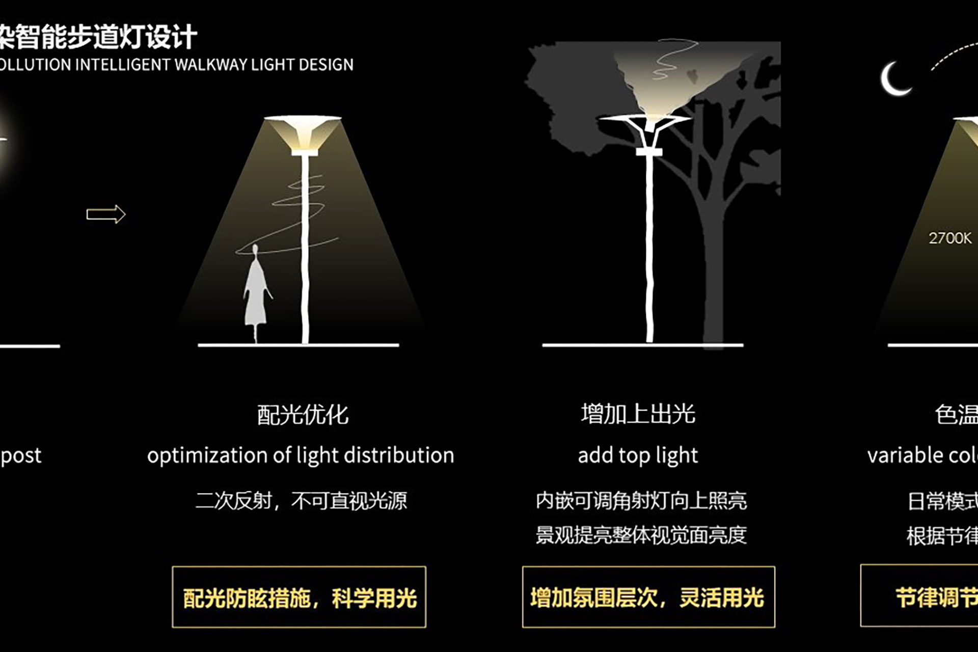 The design takes Shanghai Xujiahui Park as a demonstration site to explore the synergistic application of light pollution prevention and control and healthy lighting to improve the night-time light environment and reduce the impact of light pollution on residents’ health. Aiming at the existing light pollution problems in the park, we realized a technological breakthrough by renovating and upgrading the intelligent trail light system: designing and producing environmentally friendly lamps, healing light pollution prevention intelligent trail lights and seasonal healing color fog intelligent music immersive garden lights. At the same time, the new system adopts dynamic color temperature and brightness adjustment technology, which realizes adaptive lighting regulation and control of pedestrian flow and environment through intelligent sensing function and intelligent lighting monitoring platform, thus improving lighting uniformity and visual comfort.