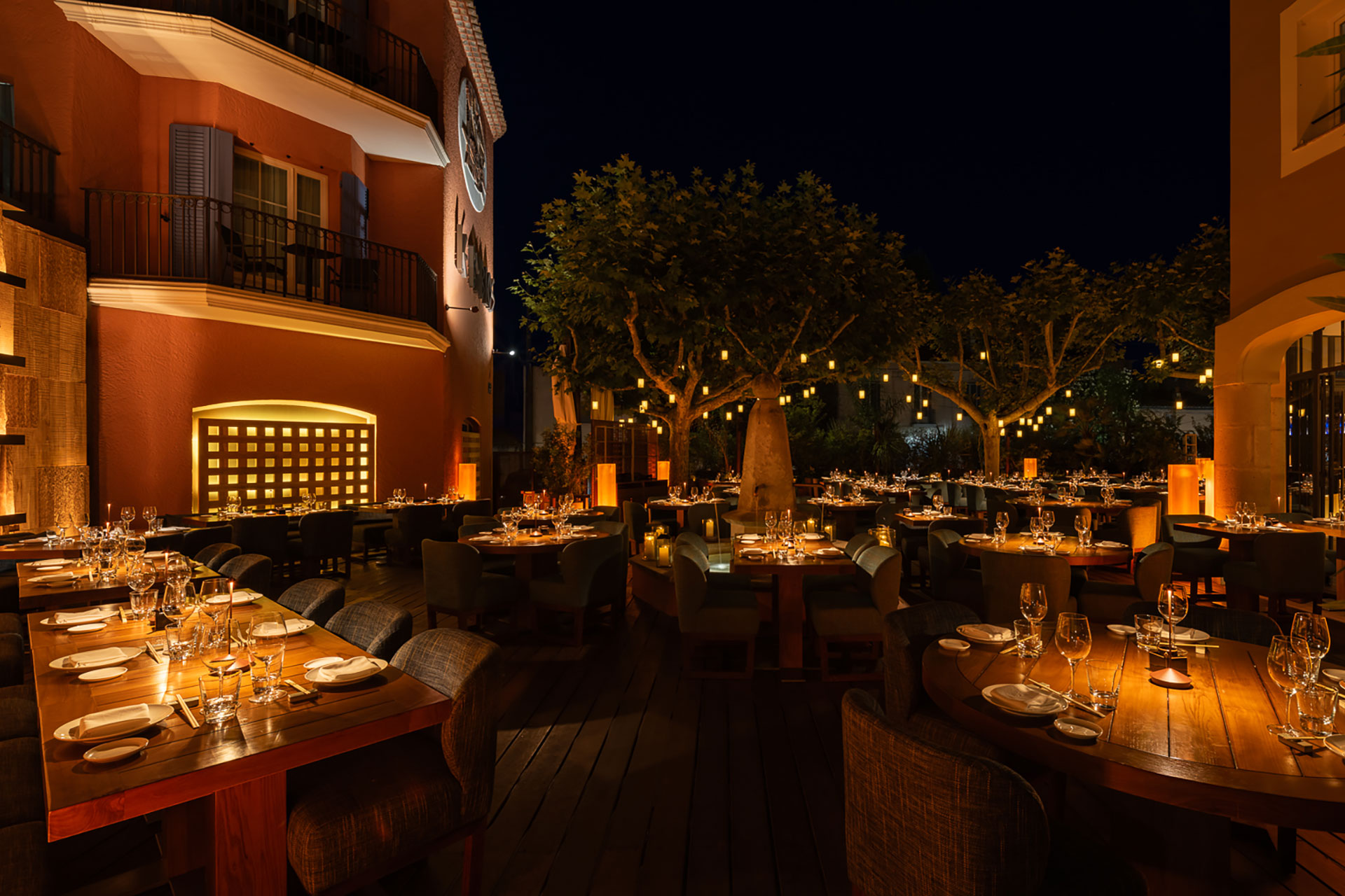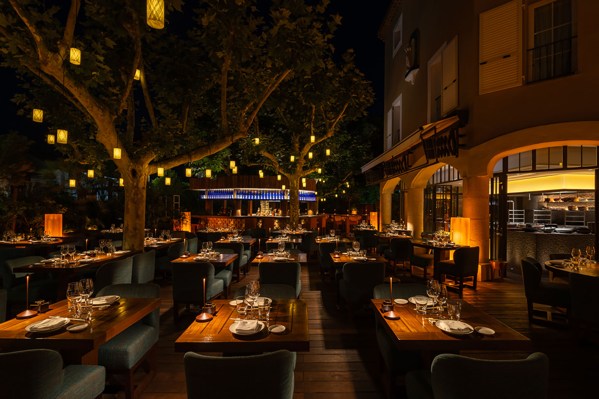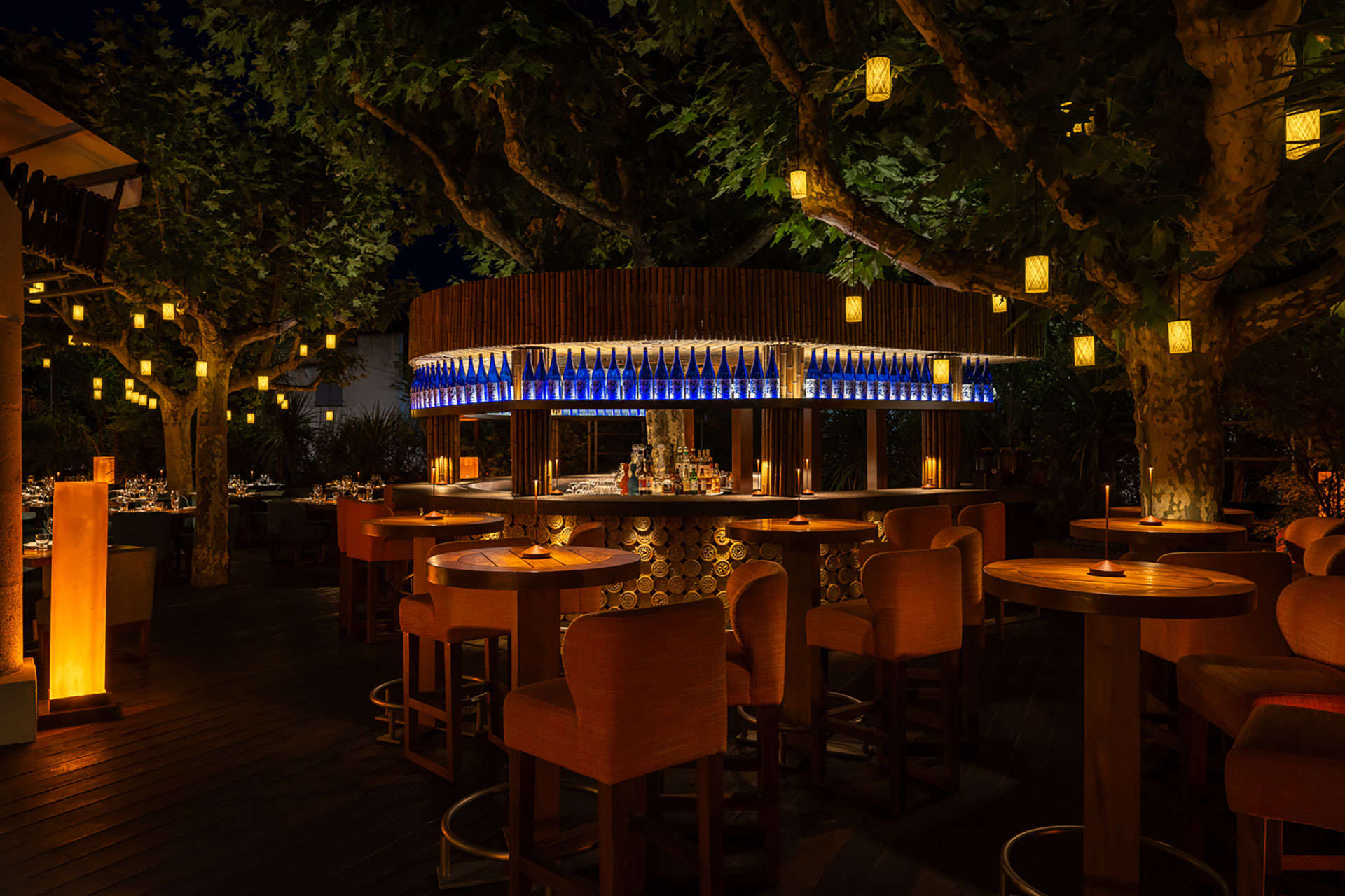 Set within the legendary Hotel Byblos on the French Riviera. Zuma St Tropez is a fully outdoor dinning experience connecting you to your surroundings while you enjoy dinner under the stars. Warm ambient tones lightly touch and wash the beautiful unique craftmanship of the finishes, helping to create layered and soft lighting effects throughout the space with dynamic moments from the robata with the illuminated hood contrasting the uplighting to the stone counter and open flame cooking. The tress within the centre of the space which include bespoke pendants and the surrounding planting help to making it feel very intimate.